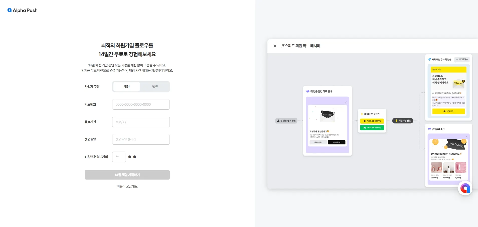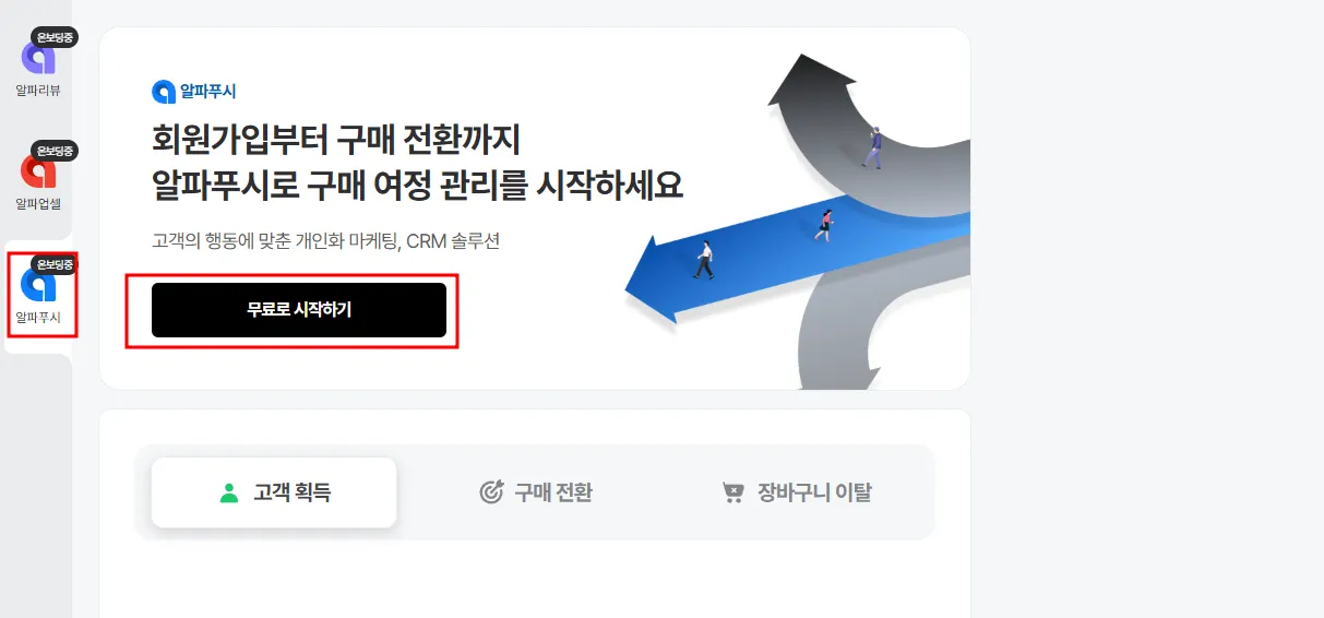 알파푸시는 필수 정보를 모두 입력하셔서 무료 체험을 시작하신 후, 기능을 활성화 해 주시면 자동으로 설치되므로 별도의 설치 작업이 필요하지 않습니다