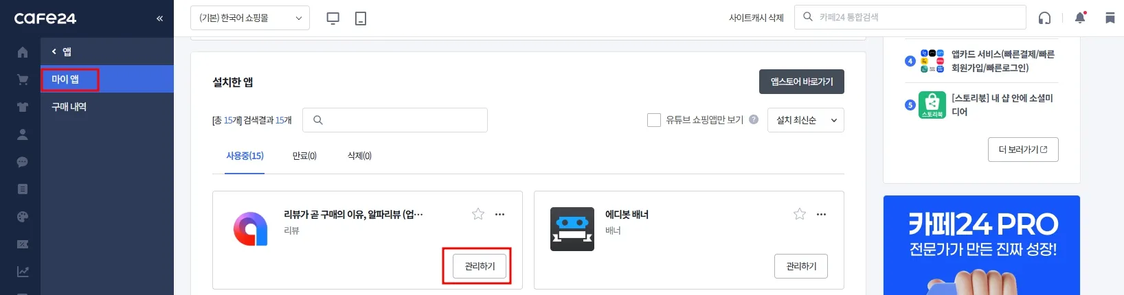 [카페24 어드민 로그인 > 앱 > 마이 앱 > 관리하기]