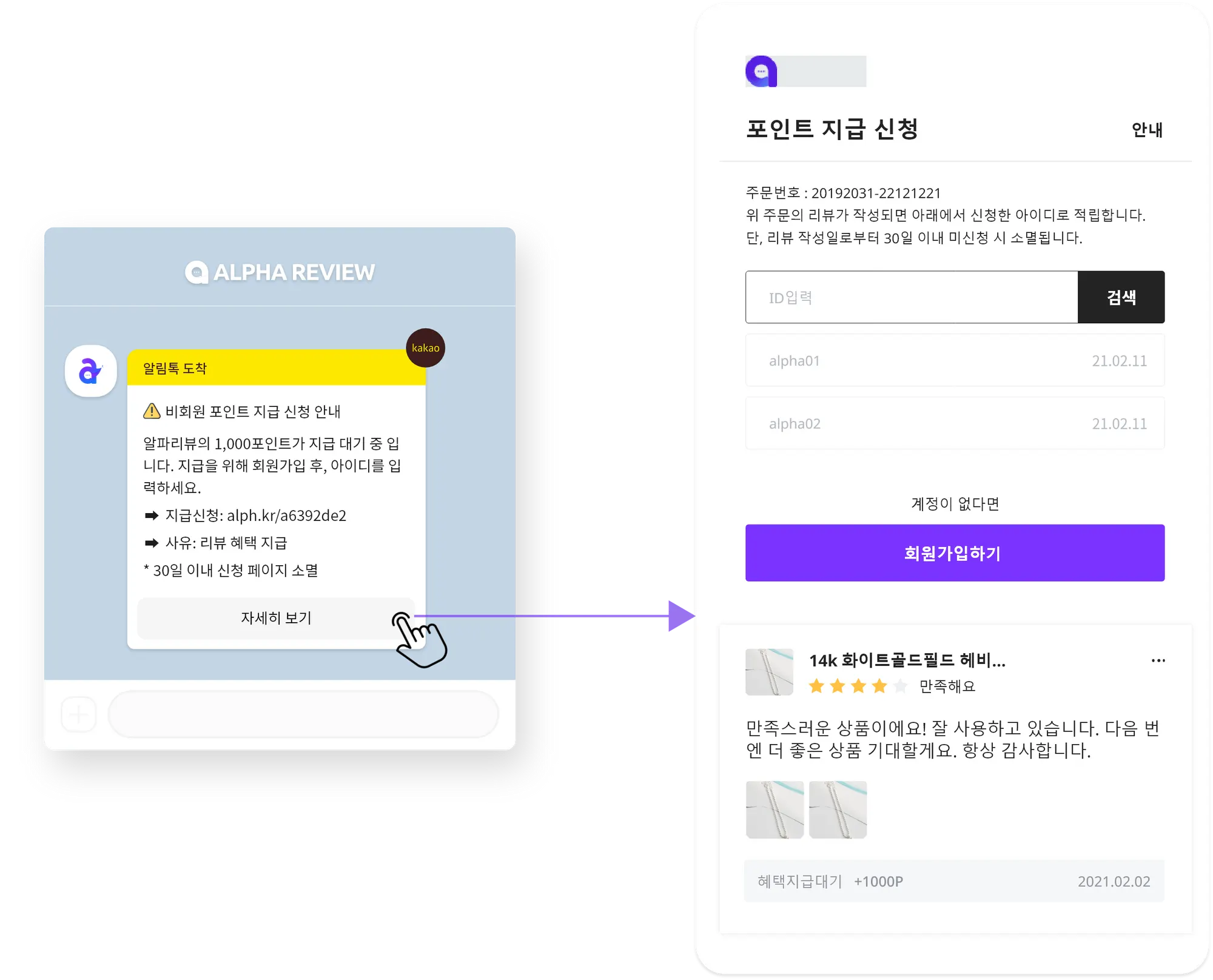 → 회원 가입 유도 알림톡 발송 → 회원 가입 후 알림톡 내 링크에서 ID 입력 → 시스템이 포인트 지급