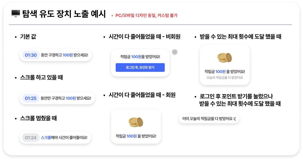 지급 조건: n초 이상 쇼핑몰 페이지 내에서 스크롤을 움직이며 탐색 했을 때 적립금이 지급 됩니다