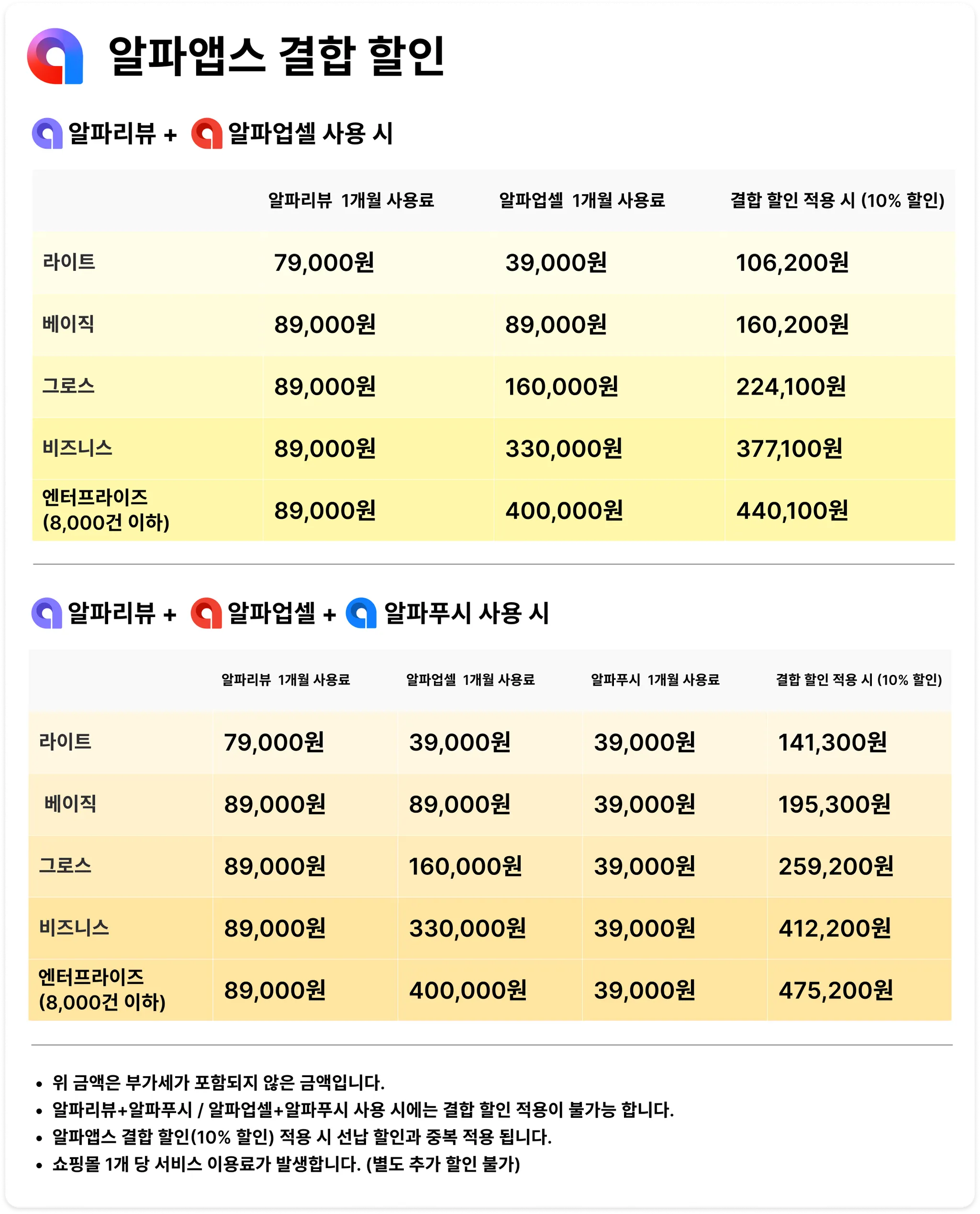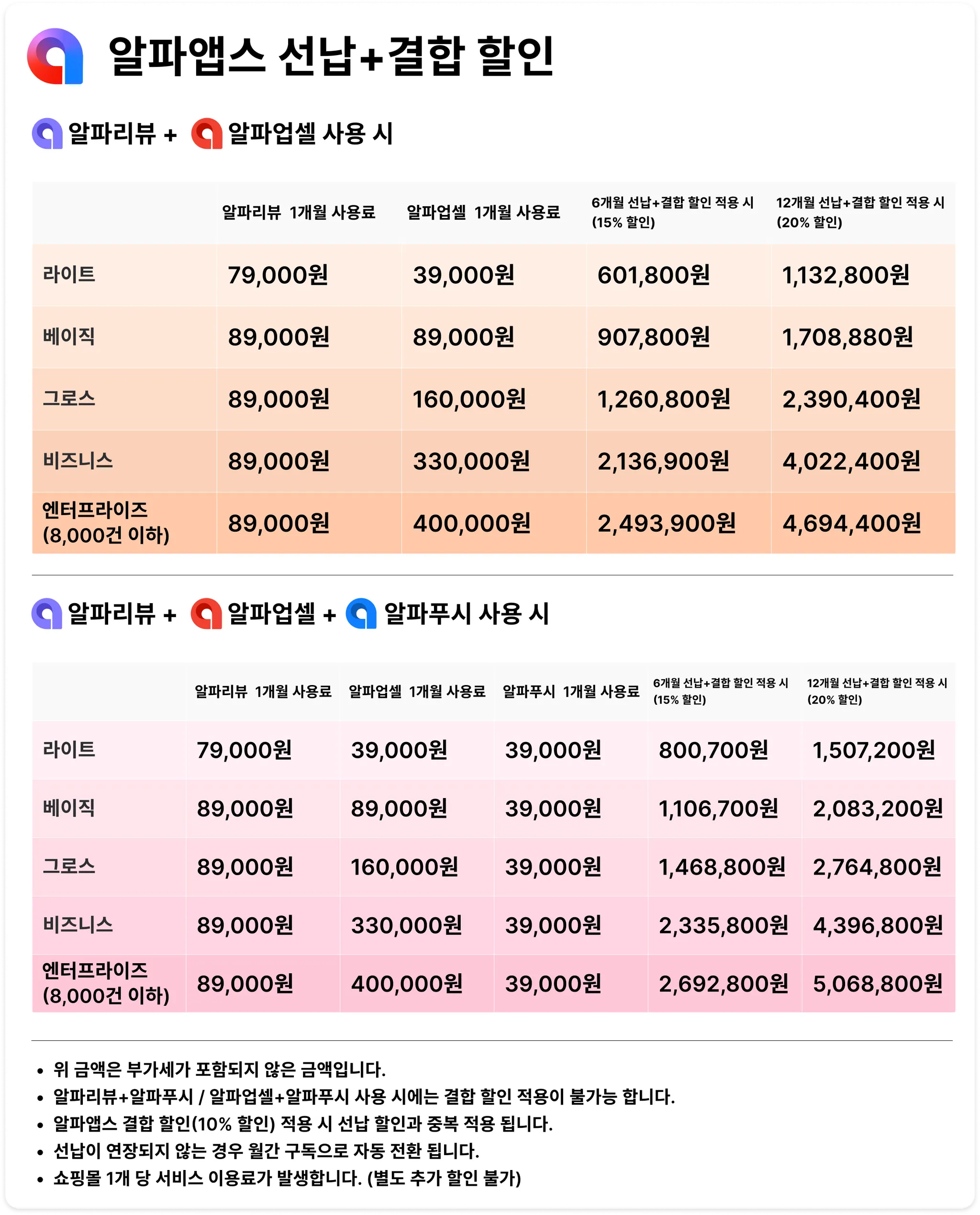 알파앱스의 세 가지 솔루션 함께 이용 시 10% 추가 할인 적용 (선납 시 중복 할인)