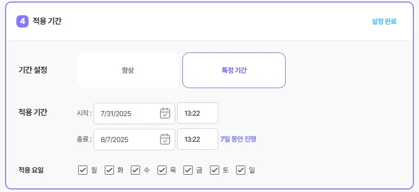 프로모션의 적용 기간을 설정하실 수 있어요!