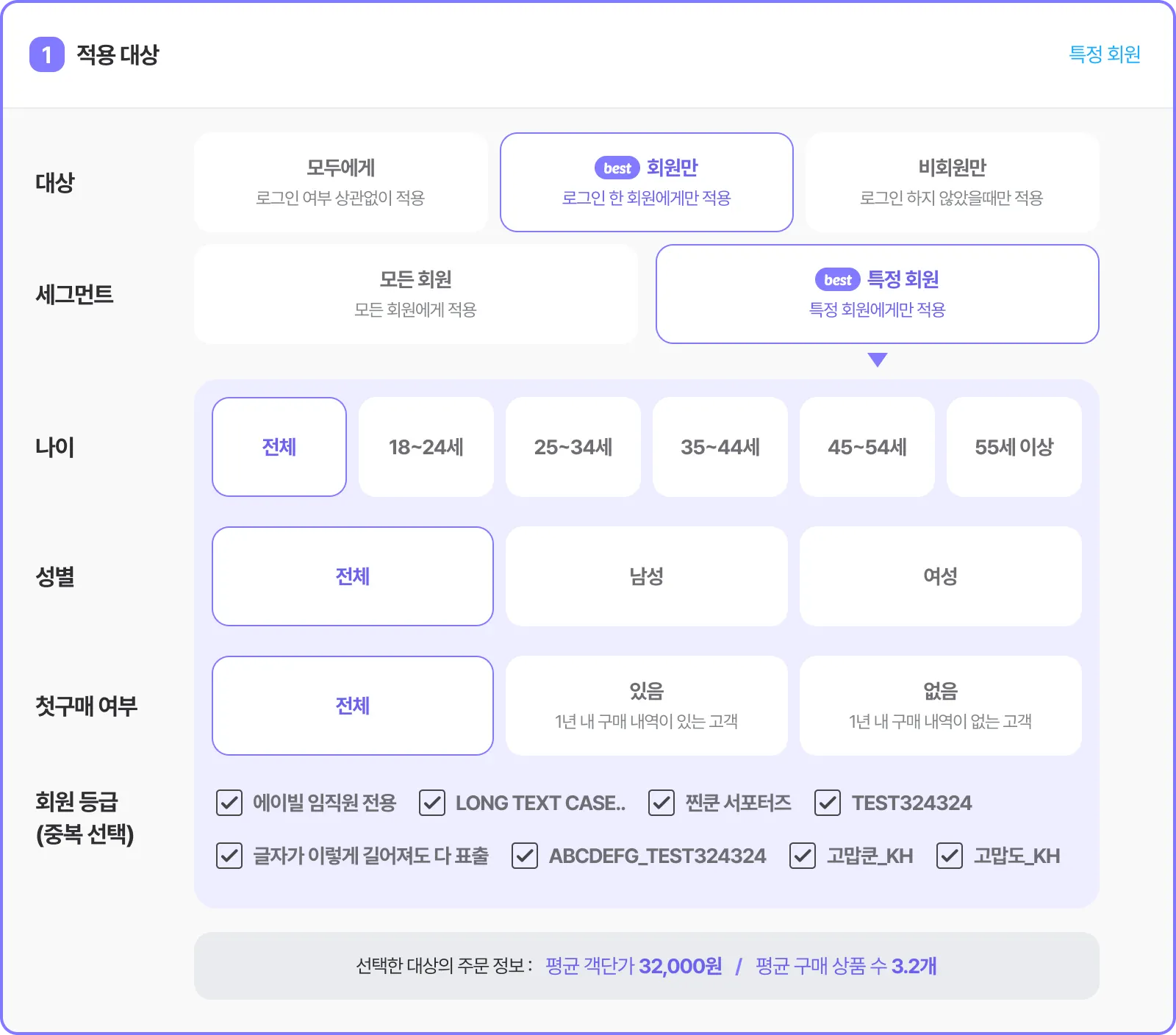 회원/비회원으로 구분하거나, 혹은 특정 세그먼트에만 적용되도록 설정할 수 있어요