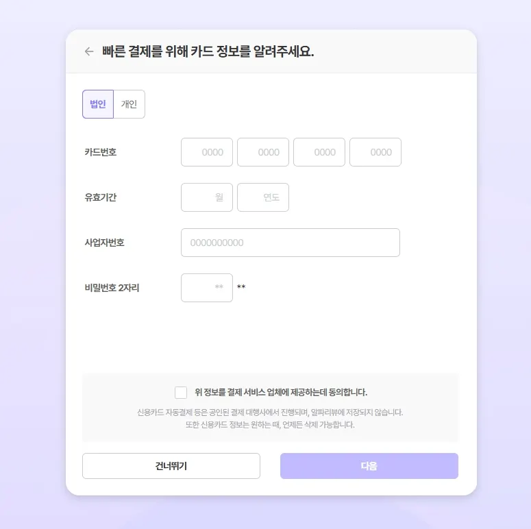 서비스 이용 시 카드 정보는 반드시 입력 되어있어야 하는 필수 정보이기 때문에
