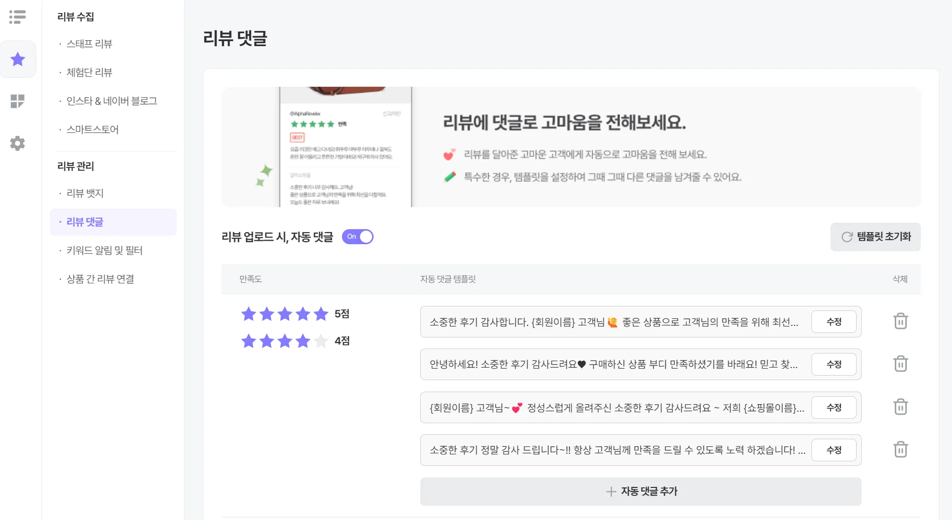 자동 댓글이란 고객이 리뷰를 작성했을때 자동으로 댓글이 달리는 기능이에요!