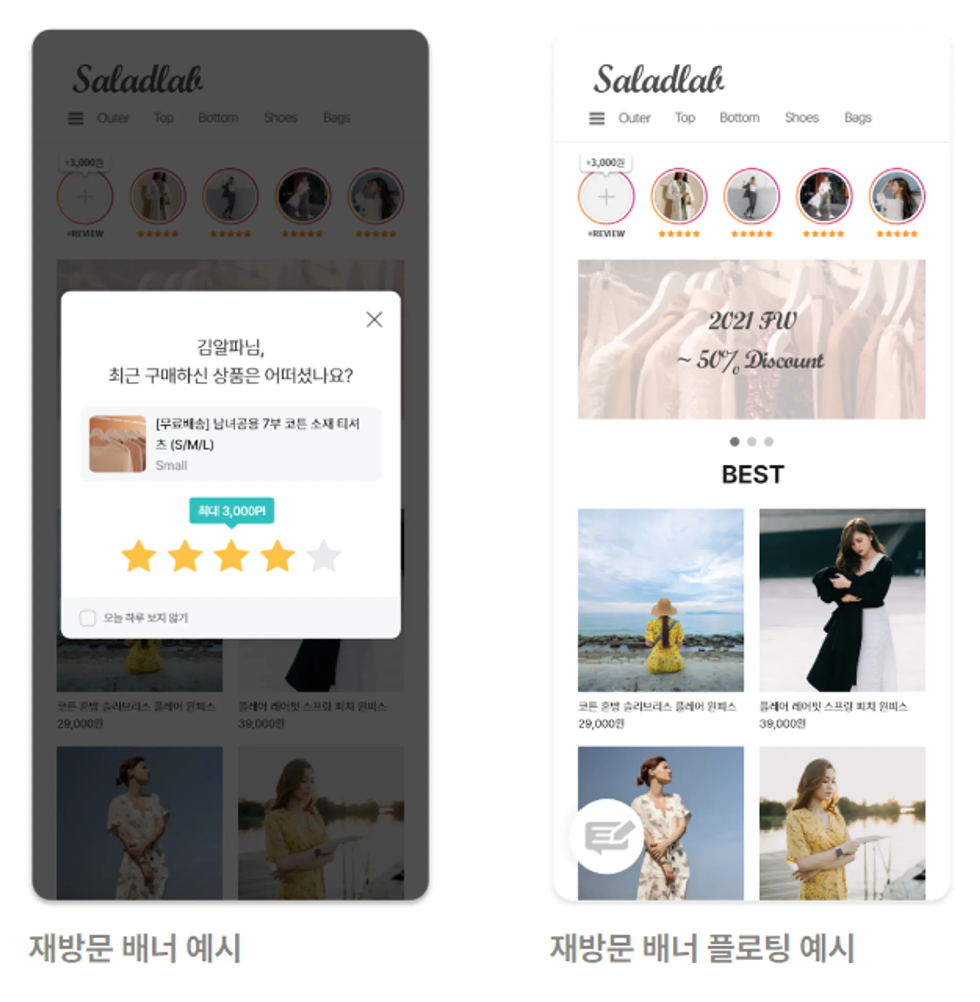 재방문 배너와 플로팅 배너는 상품 구매 후 아직 리뷰를 작성하지 않은 고객이 자사몰에 재방문 했을때, 리뷰를 작성할 수 있는 상품이 남아있다고 알려주는 기능이에요!