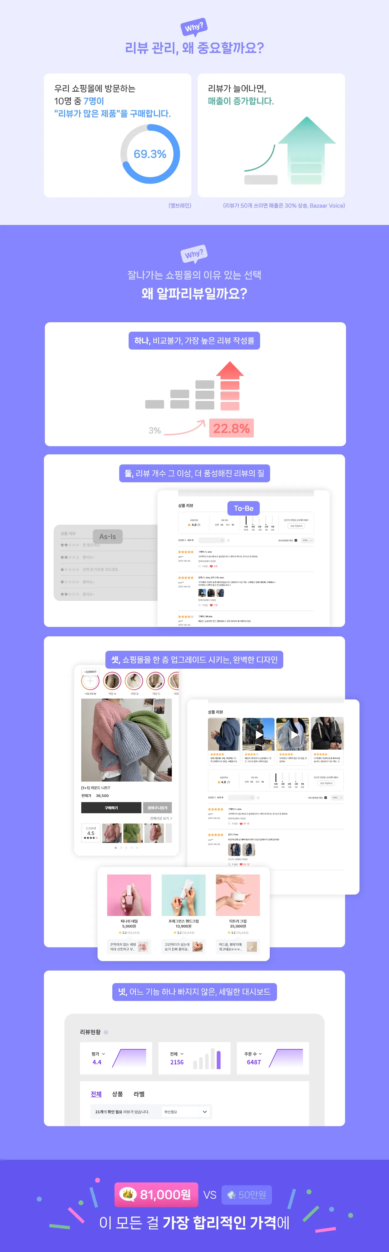 알파리뷰는 카페24 전용 리뷰 통합 관리 프로그램으로, 리뷰의 작성, 게시, 관리 등 리뷰에 관련된 모든 기능을 제공해드리는 솔루션 입니다!