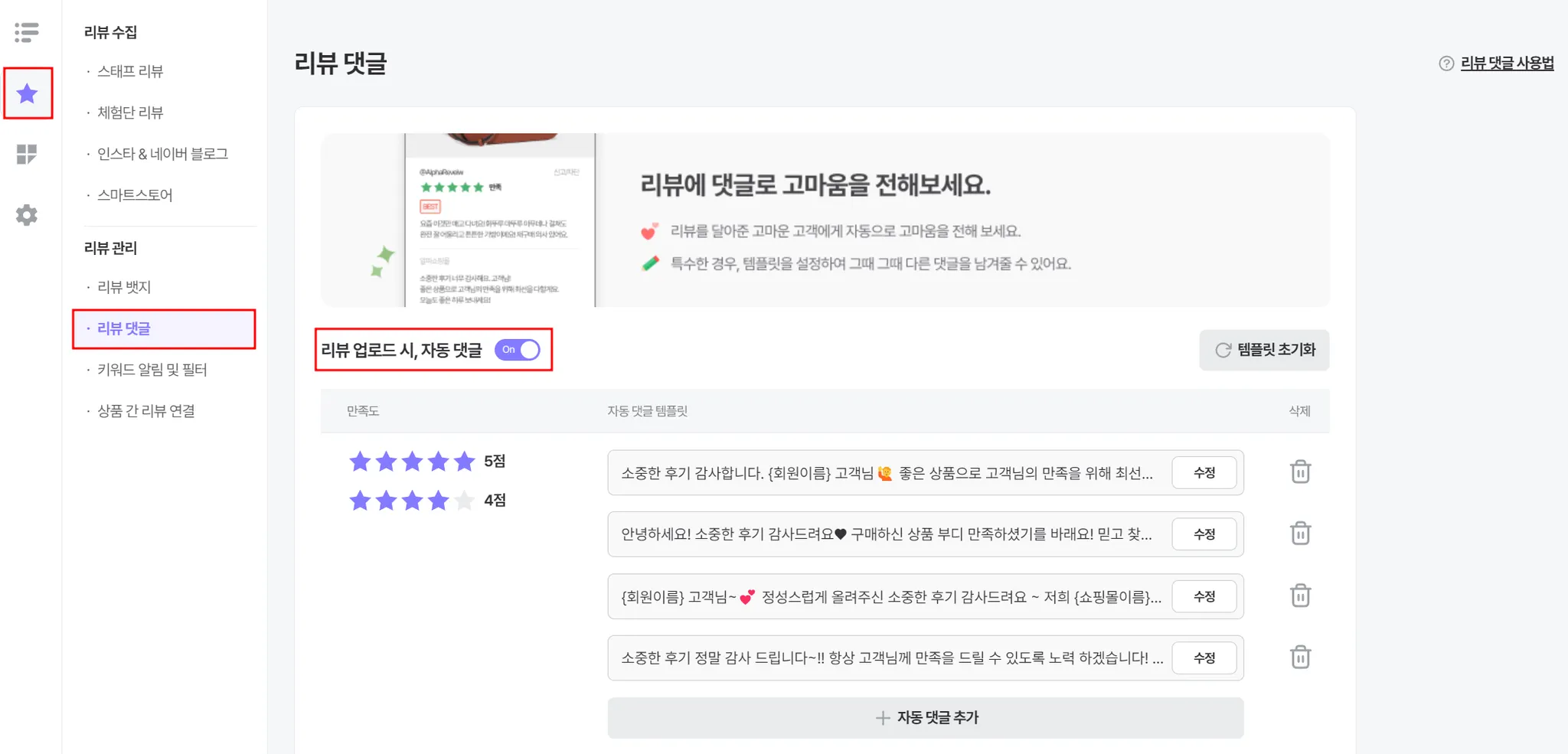 리뷰의 만족도(별점)에 따라 댓글이 자동으로 작성되며, 수동 템플릿을 생성하여 수동으로도 관리하실 수 있습니다!