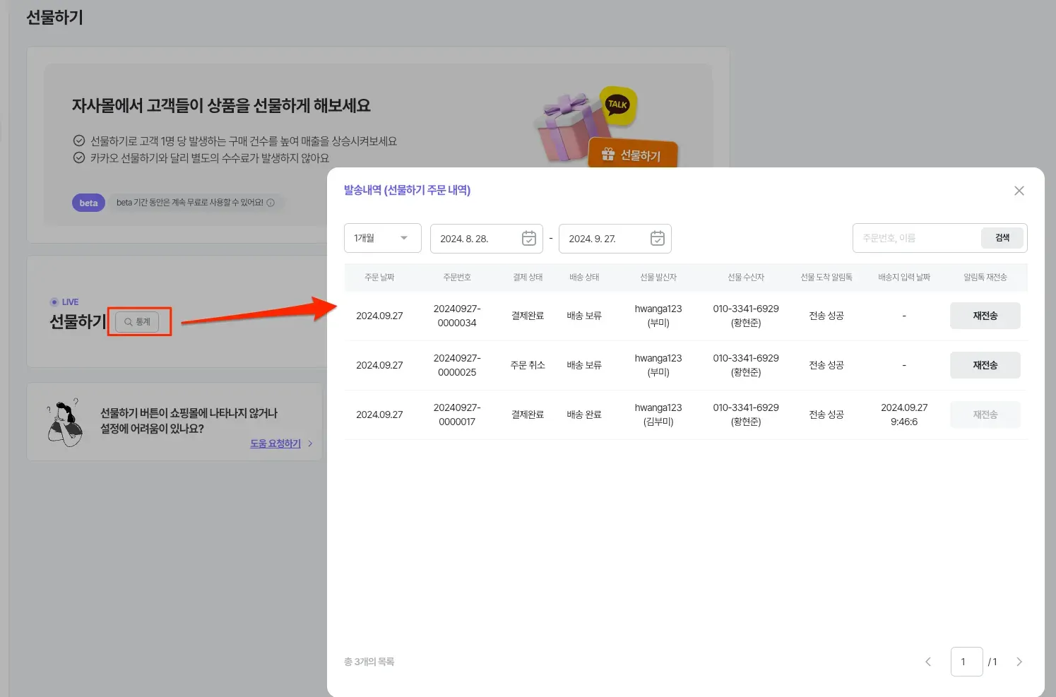 선물하기의 통계와 카페24에서 주문 데이터를 확인 할 수 있어요!