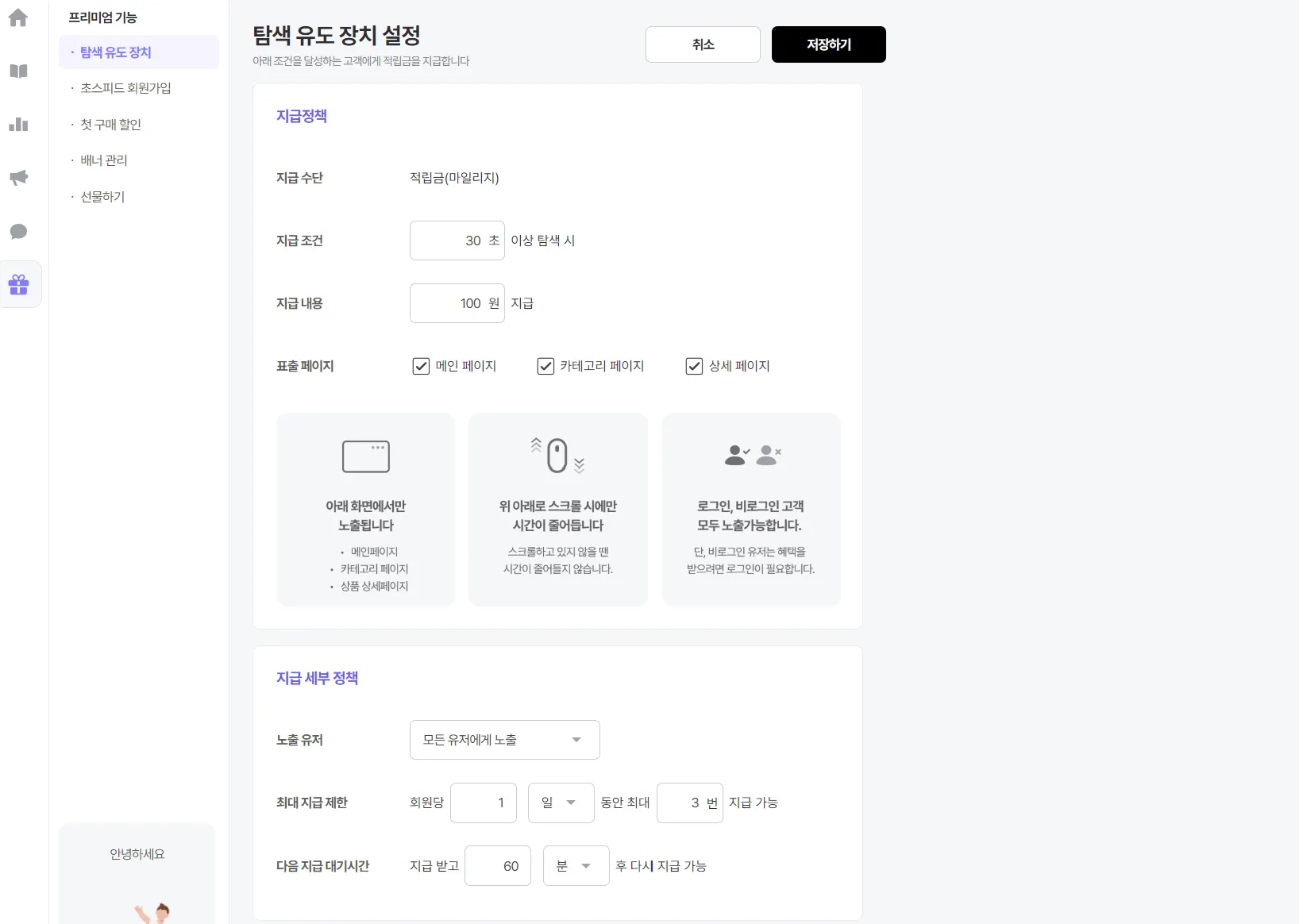 지급 조건, 세부 정책, 색상 커스텀까지, 원하는 방식으로 보여지고 포인트가 지급 되도록 설정 할 수 있어요