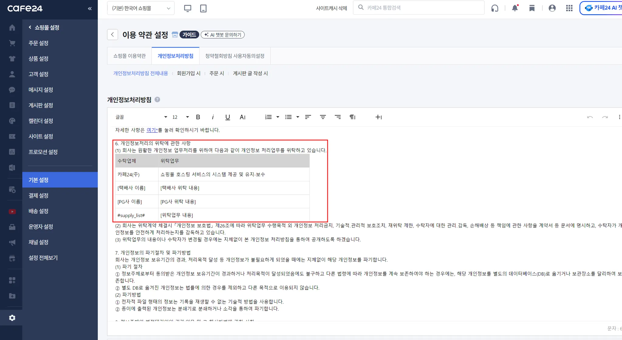 카페24 접속 경로: [쇼핑몰 설정 > 기본 설정 > 이용 약관 설정 > 개인정보처리방침]
