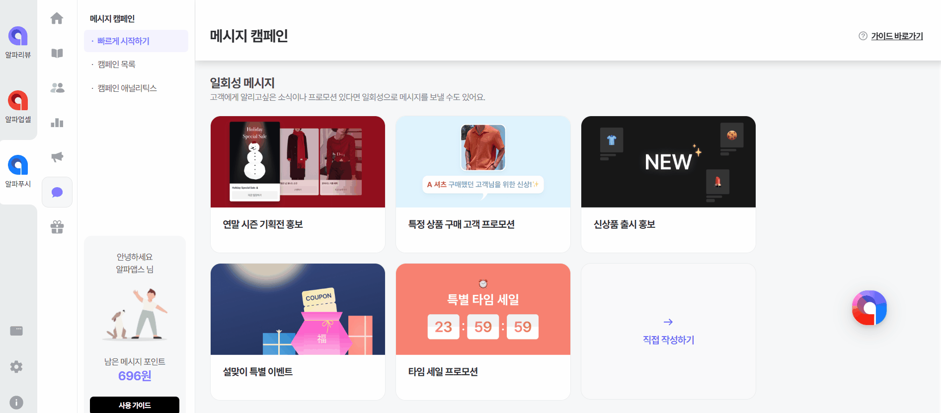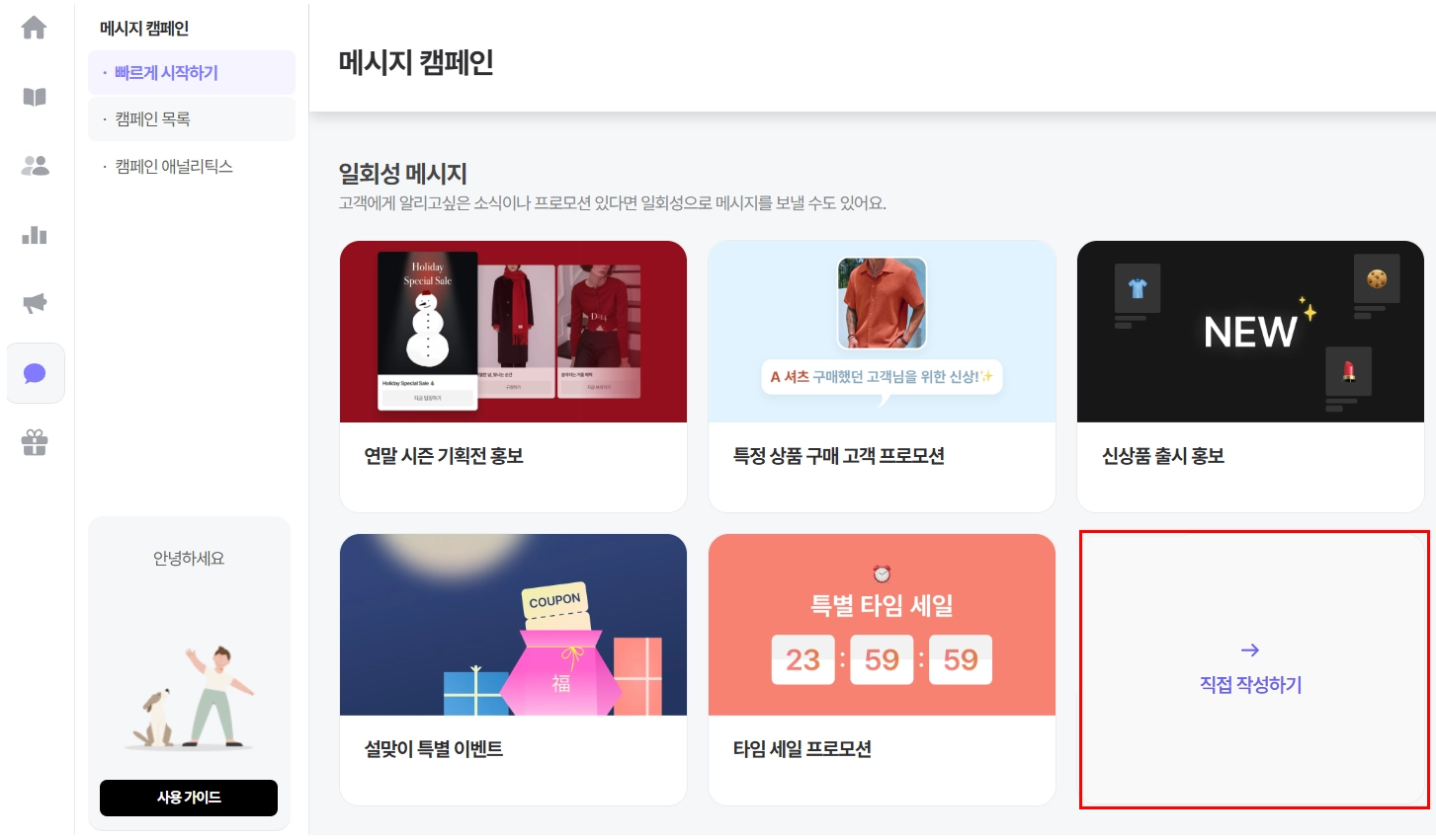 접속경로: [메세지 캠페인> 빠르게 시작하기 > 일회성 메시지 캠페인 선택]