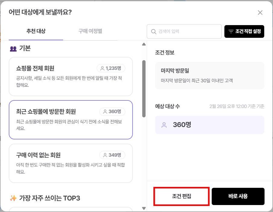 발송 대상자 선택 시 예상 발송 고객 수를 확인 할 수 있어요