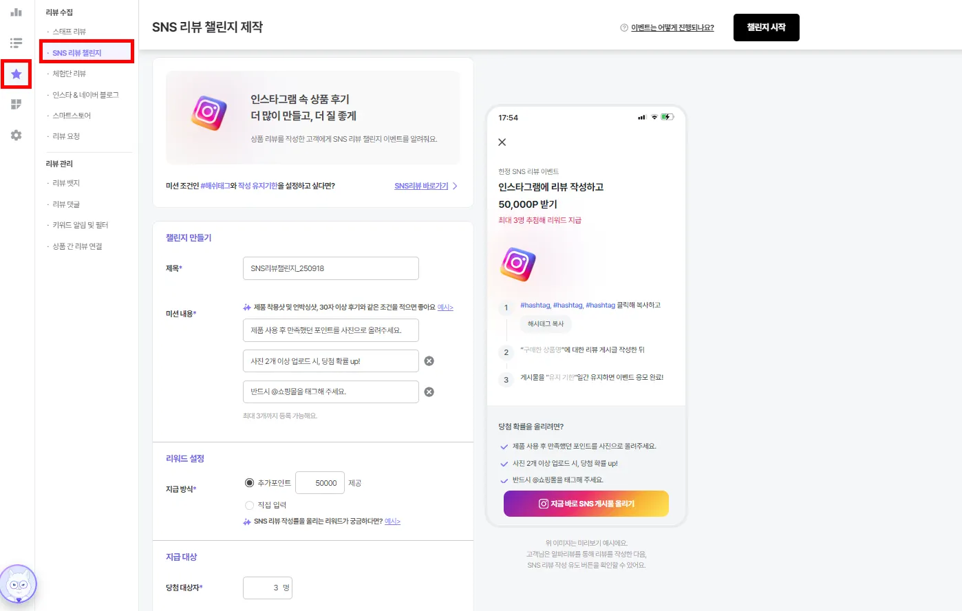 SNS 리뷰 챌린지 기능은 [SNS 리뷰] 설정을 사용하고 계셔야해요!