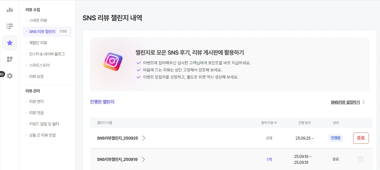 챌린지를 설정 해두셔도 고객은 SNS 리뷰를 작성 할 수 없습니다