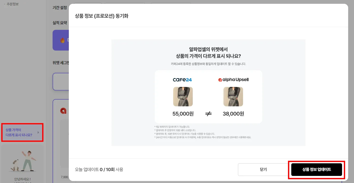 알파업셀의 위젯에 카페24의 할인가 및 판매가를 연동하고 있어요!