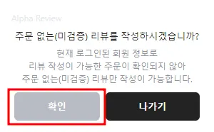 미검증 리뷰 팝업창에서 “확인” 버튼 클릭