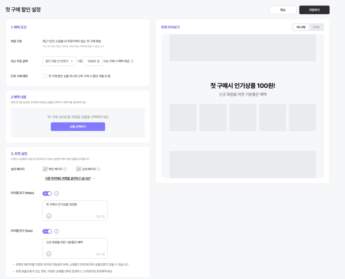첫 구매 할인 위젯에서 보여질 문구까지