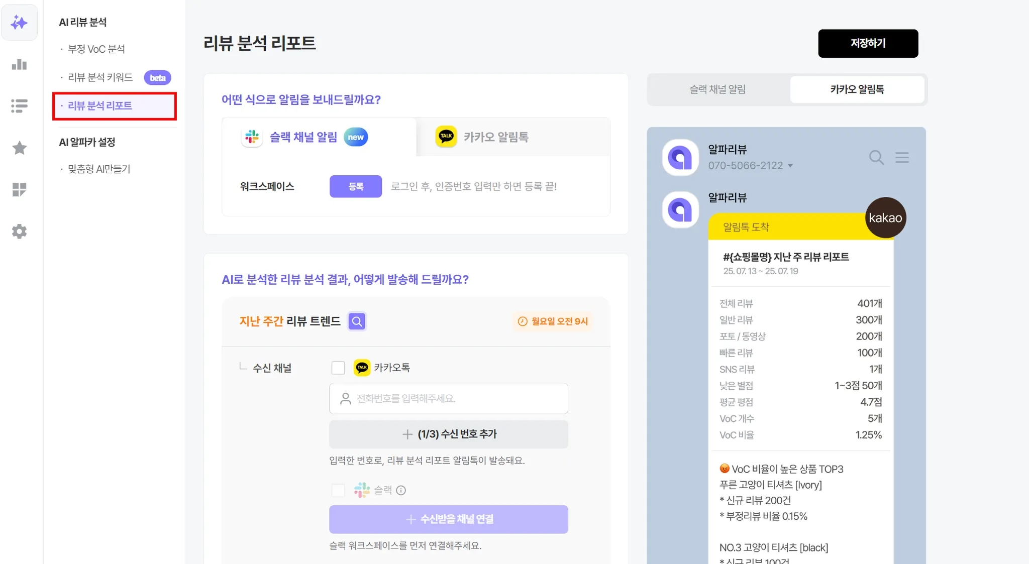 각각의 리포트는 슬랙으로만 받을 수도, 슬랙과 카카오톡 모두 받을 수도 있어요