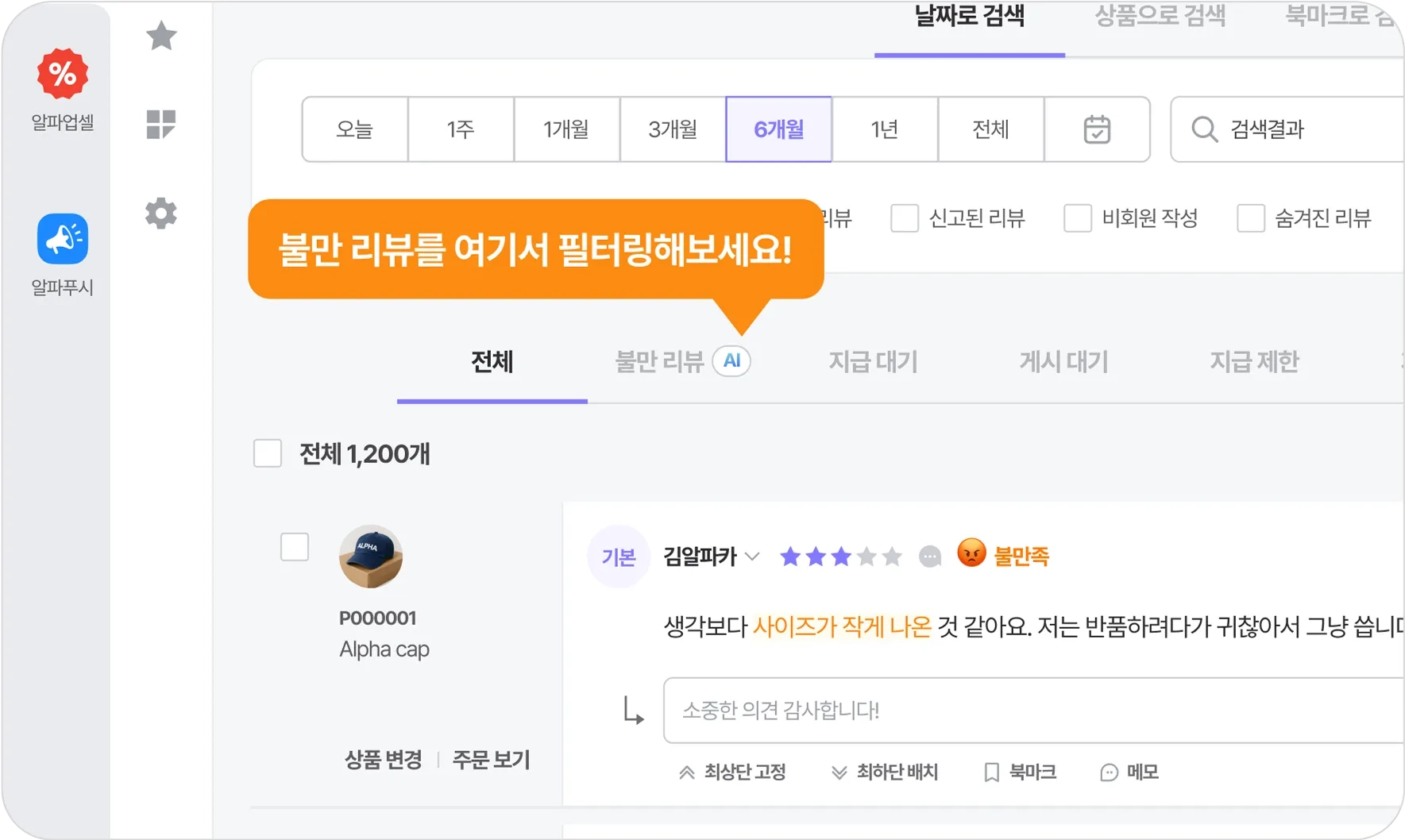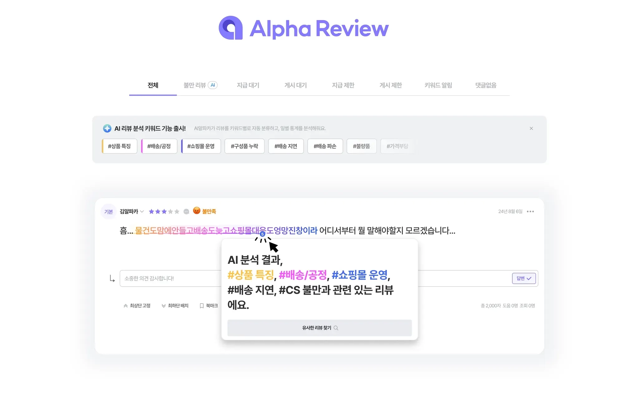 알파리뷰는 리뷰 내용을 분석하고, 불만족한 내용이 포함된 리뷰는