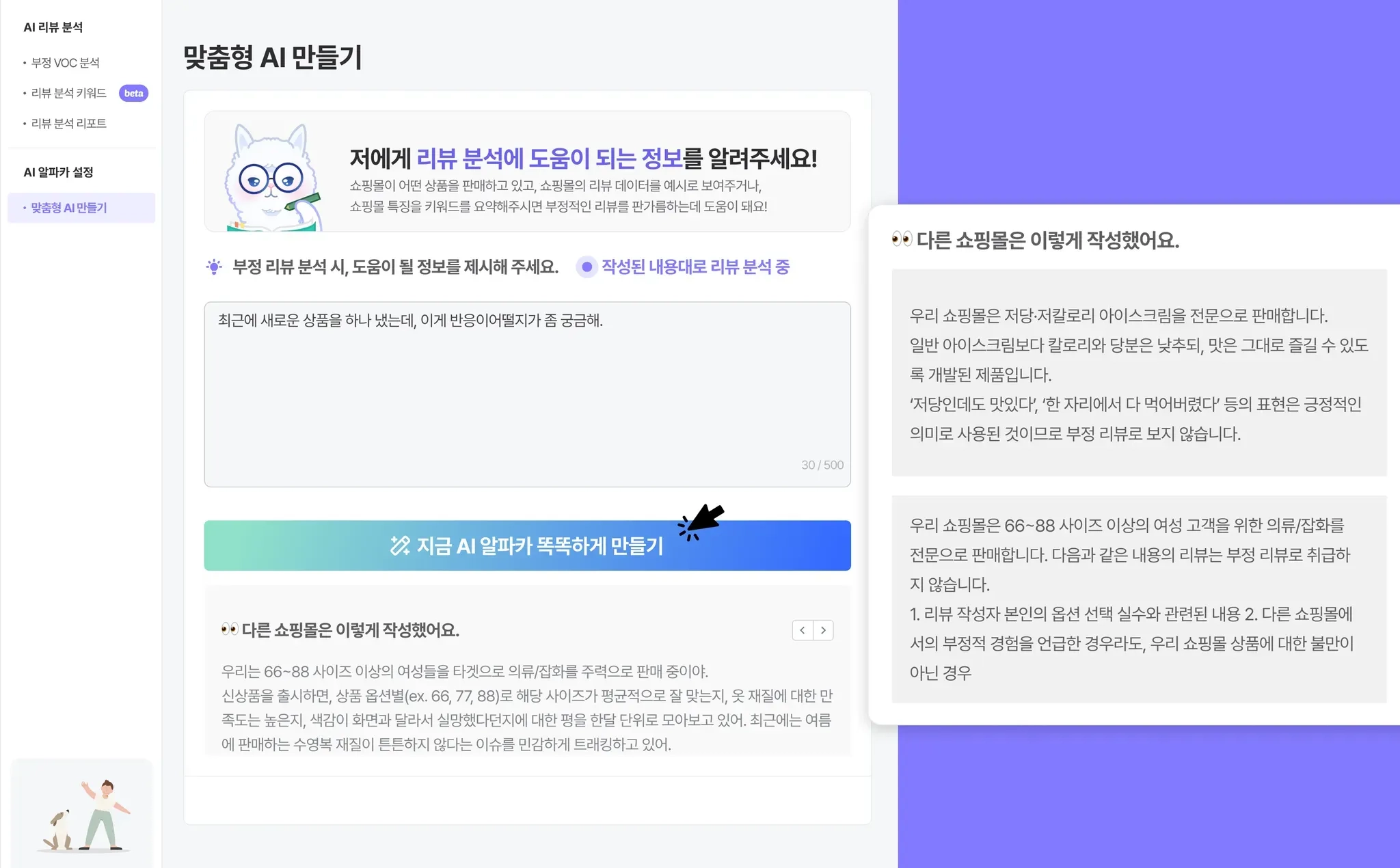 AI 알파카에게 어떤 리뷰를 불만족으로 표시할지 교육하실 수 있어요!