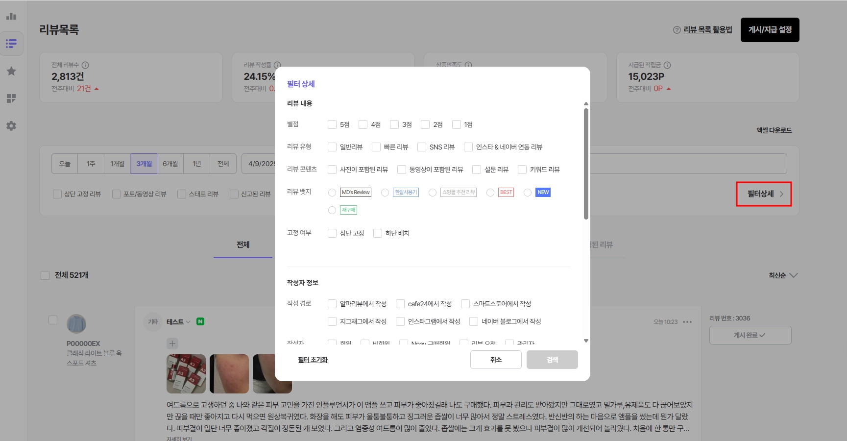 고급 필터 기능을 사용하면, 리뷰 내용/작성자 정보/리뷰 상태에 따라 다양한 조건을 선택하여 리뷰를 세밀하게 조회할 수 있어요