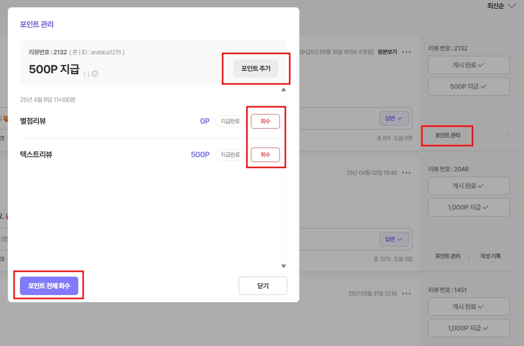 추가 포인트를 수동으로 지급하거나, 일부 항목들은 취소/회수 처리하는 작업이 가능합니다!