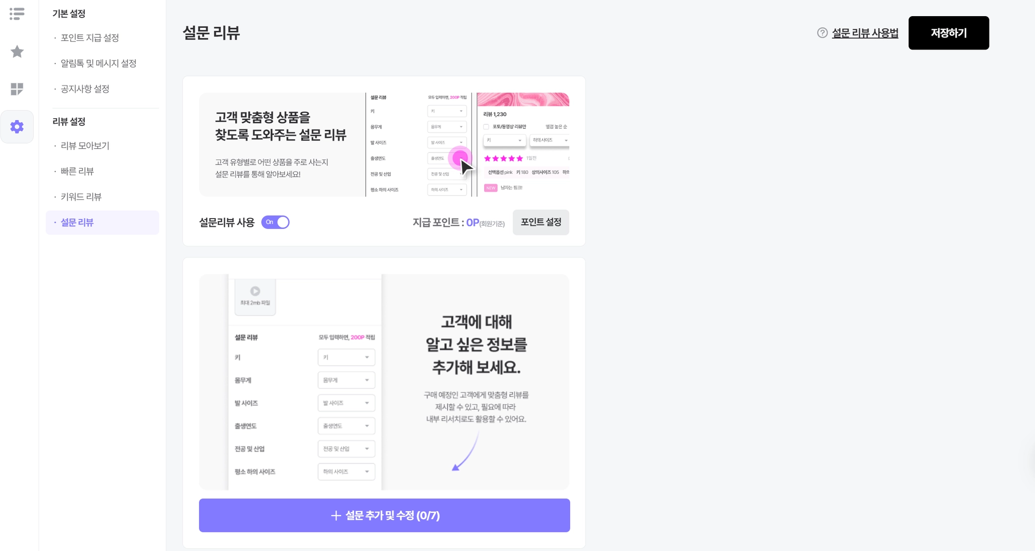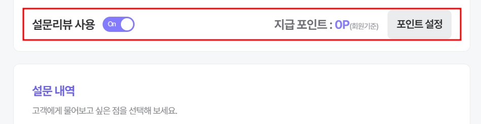 설문 항목 설정을 완료 하셨다면 설문 리뷰 활성화 및 포인트 설정까지 완료 해주세요