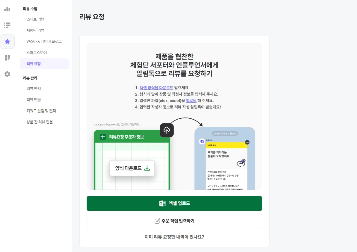 쿠팡 등 타 플랫폼의 리뷰를 자사몰에서도 보여줄 수 있도록 엑셀 파일을 수동으로 업로드하는 기능을 제공해드리고 있어요!
