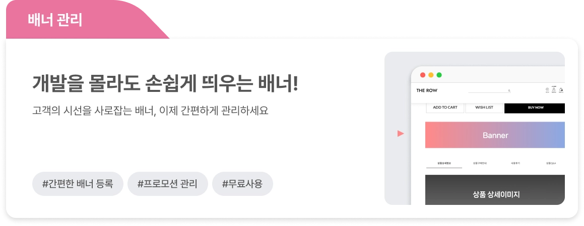 배너관리란 쇼핑몰에 띠배너, 배너 이미지부터 동영상 url을 간편하게 띄워둘 수 있는 기능이에요!