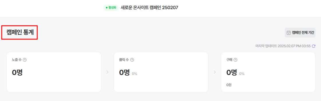 캠페인을 설정 해두고나면 몇 명의 고객에게 해당 캠페인이 보여졌고 얼만큼 클릭 되었는지 성과를 확인 할 수 있어요