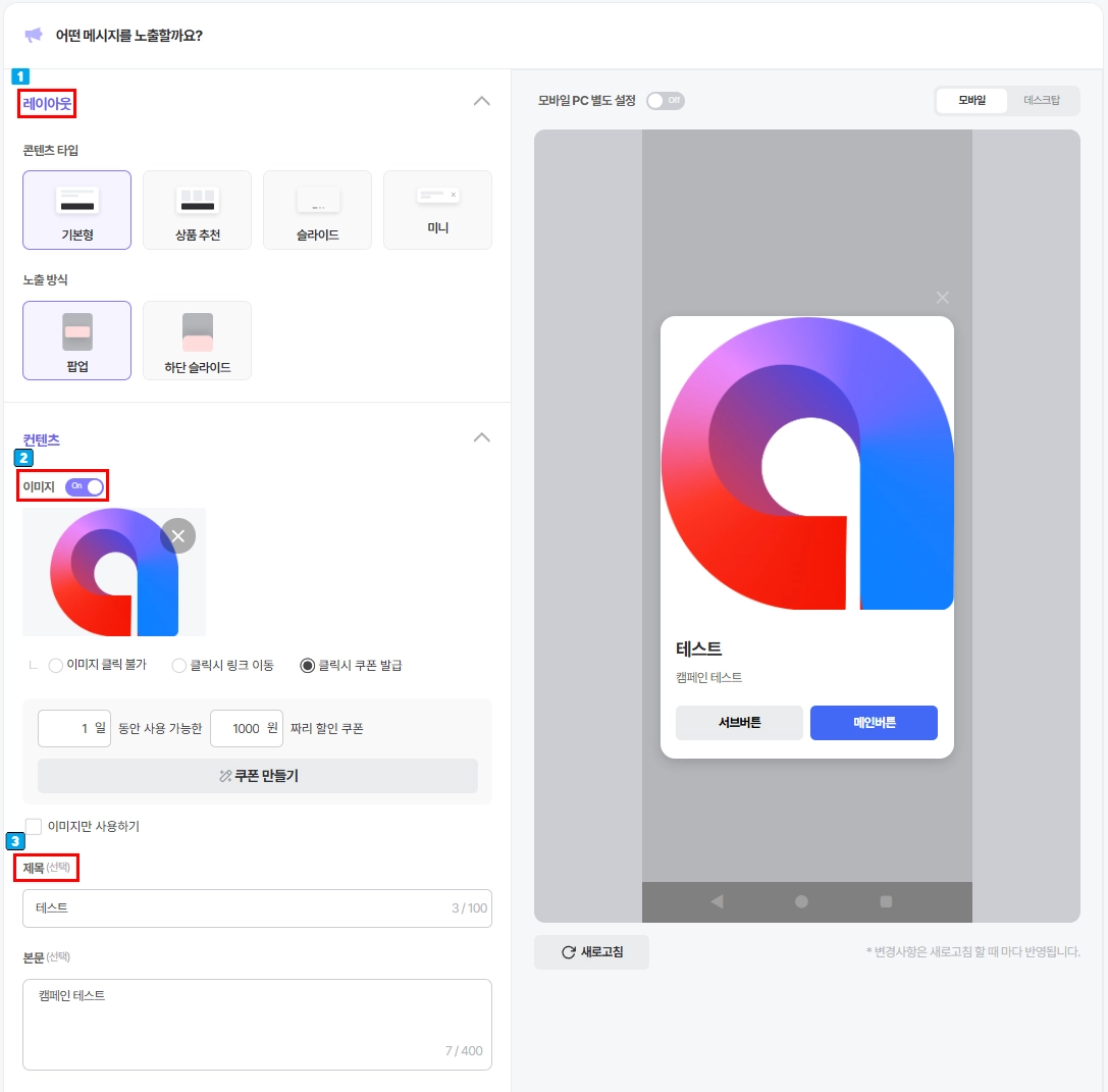 보여질 형식부터 이미지와 쿠폰까지 모두 간단하게 설정 할 수 있어요