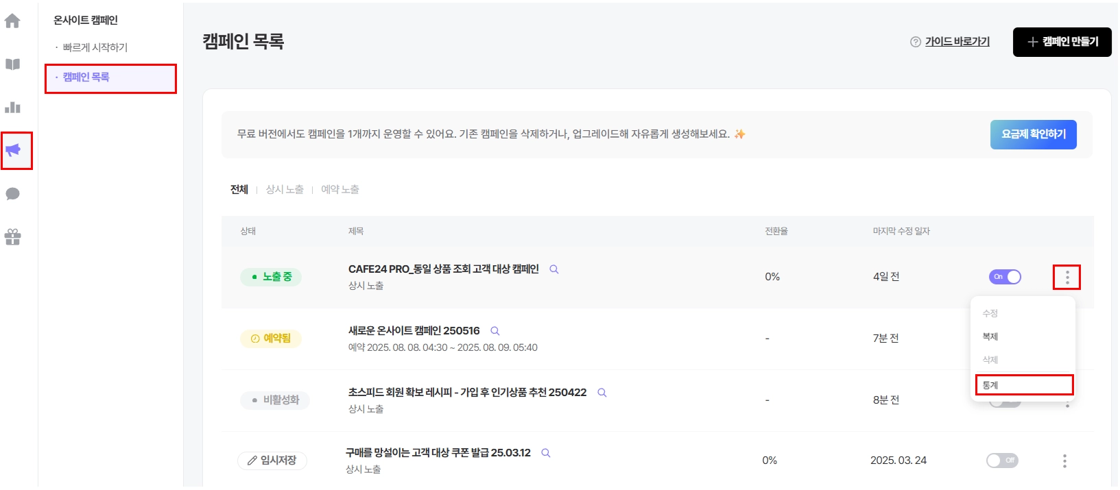 무료 플랜에서는 캠페인을 1개만 활성화 할 수 있어요