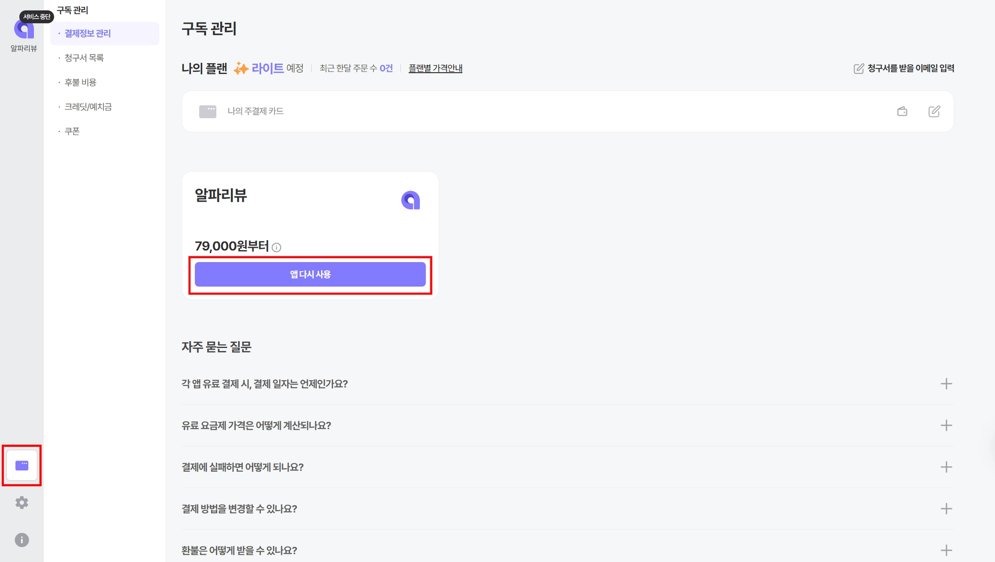 알파리뷰 대시보드 접속 후 구독 관리 화면으로 이동합니다.