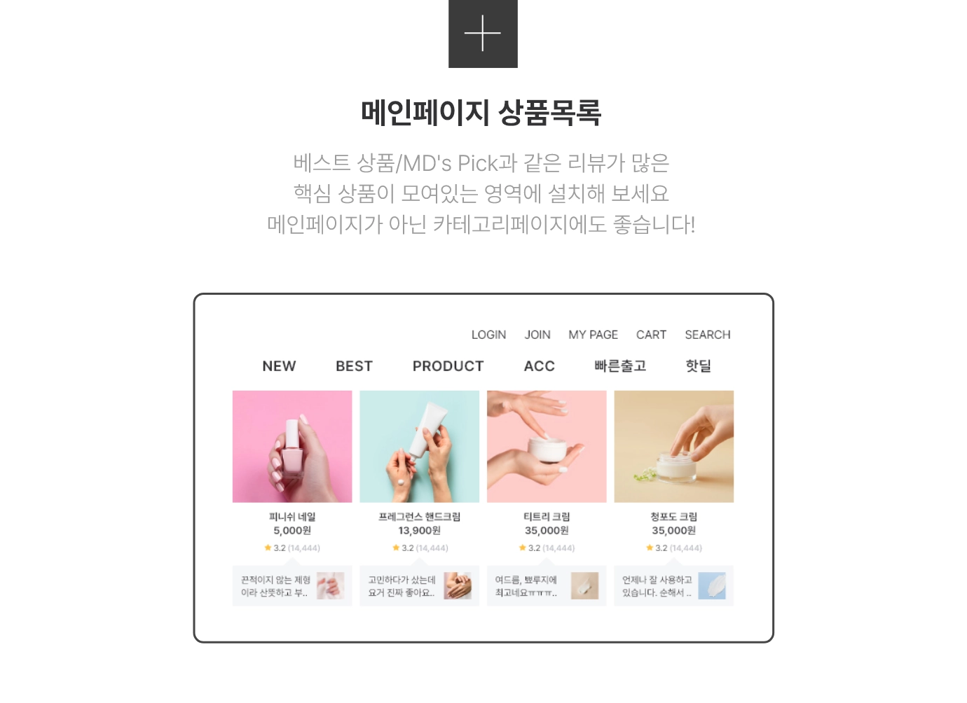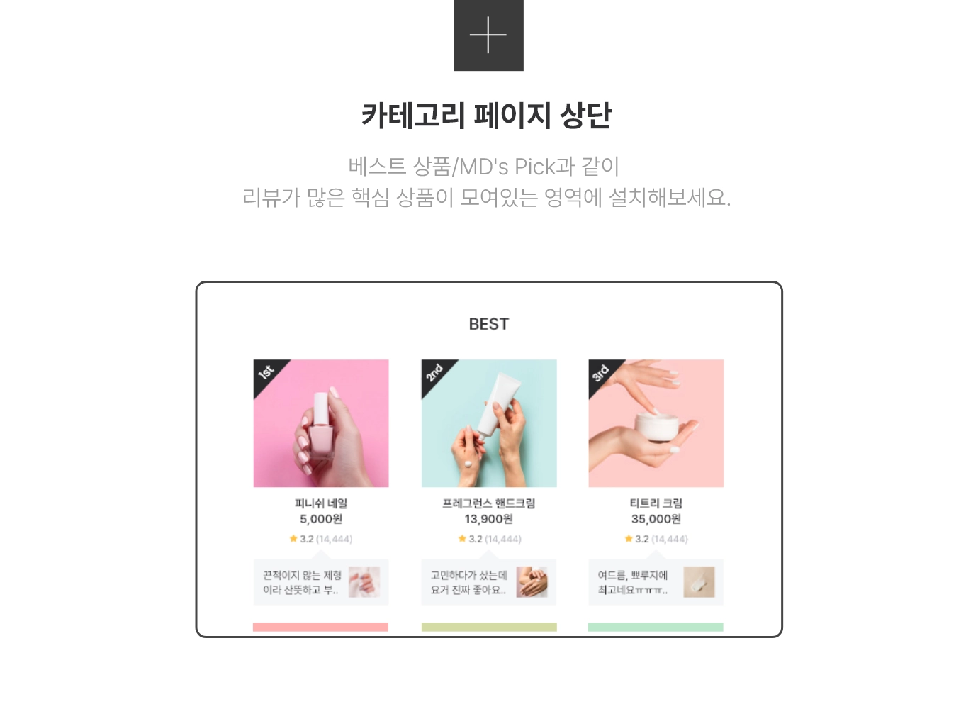 메인페이지, 상품 목록 (카테고리) 페이지 등 알파리뷰가 추천하는 설치 위치를 알려드릴게요!