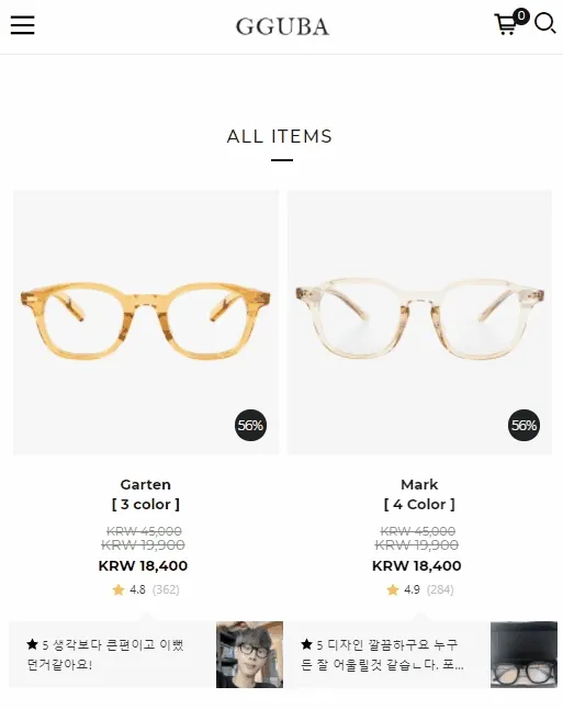 이런 고민 끝에 알파리뷰는 상품 썸네일 하단에 최적화 된, 구매를 망설이고 있는 잠재 고객의 눈길을 사로 잡을 위젯, 리뷰 롤링 위젯을 가져왔습니다