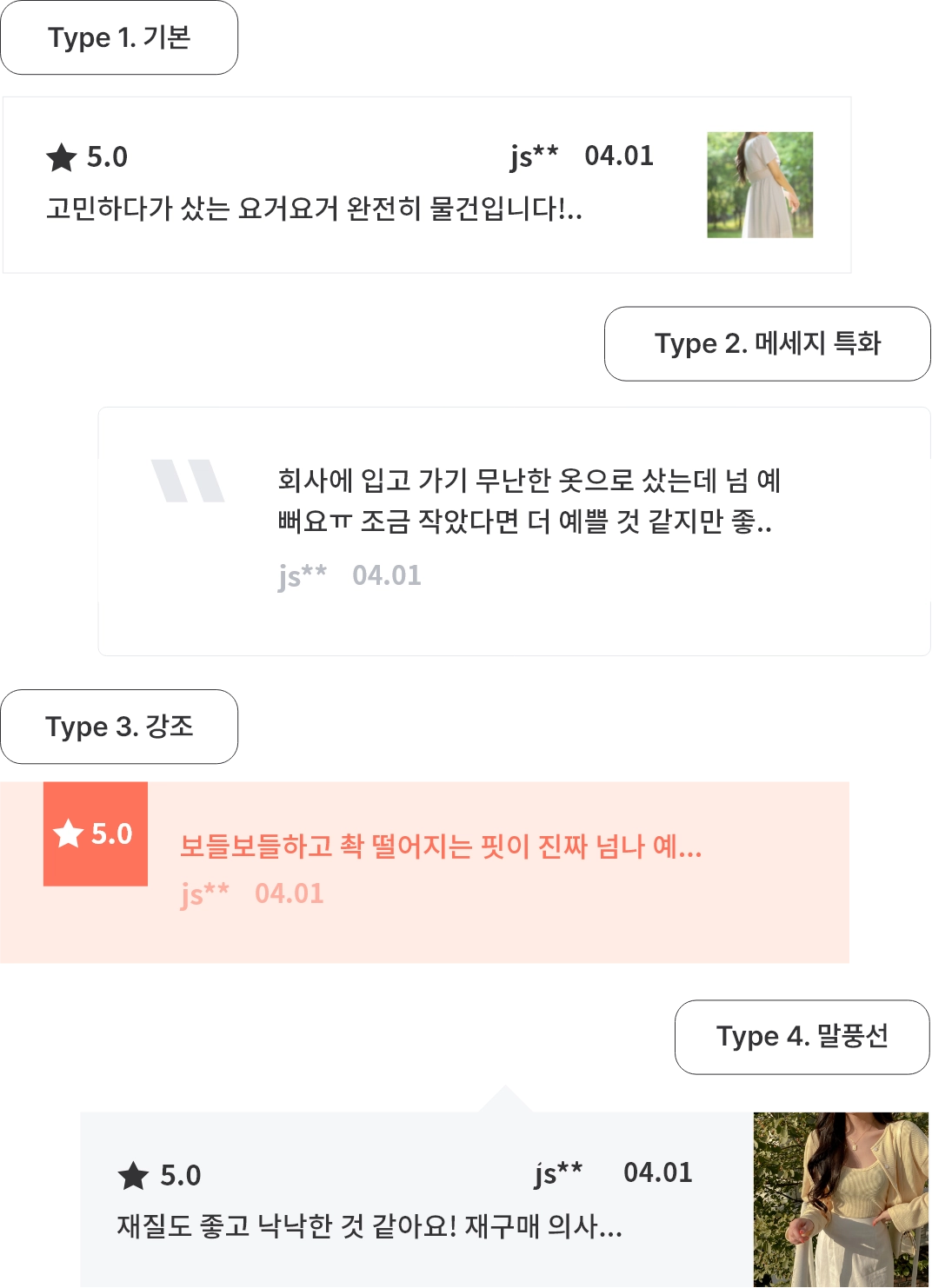 리뷰 롤링 위젯은 원하시는 스타일을 골라 사용하실 수 있어요! 포토 리뷰를 강조하고 싶다면 포토 리뷰가 강조되는 스타일을, 텍스트 리뷰를 강조하고 싶다면 텍스트가 강조되는 스타일을 이용해보시면 됩니다