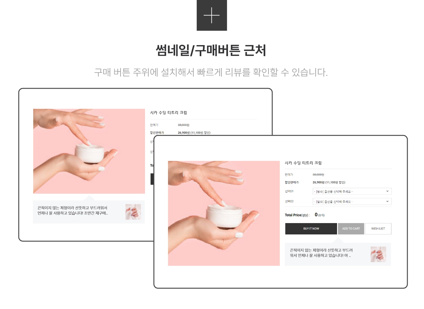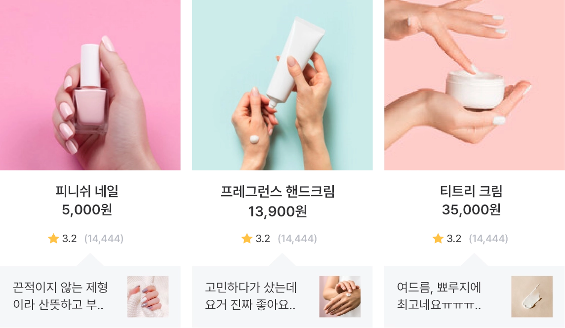 썸네일 하단에 긍정 리뷰를 띄워, 고객의 눈길을 사로잡아보세요