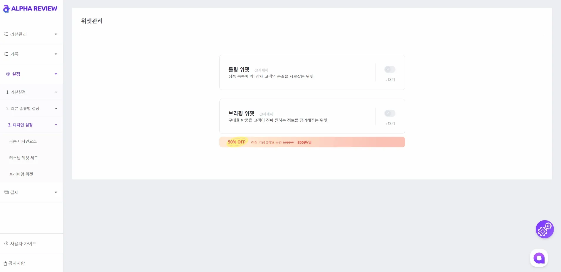 1. 알파리뷰 대시보드 [설정 > 디자인 설정 > 프리미엄 위젯]으로 이동해주세요.