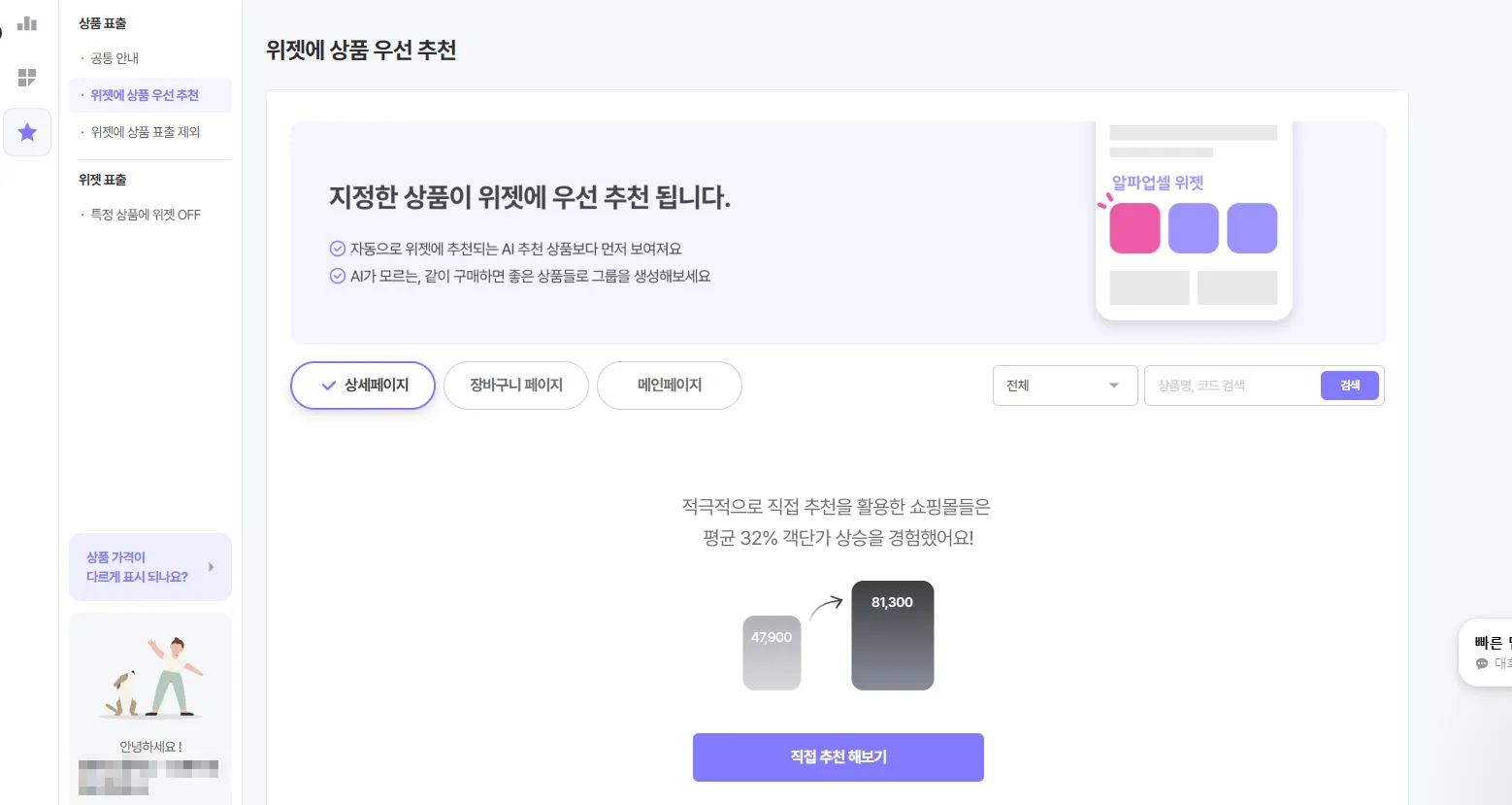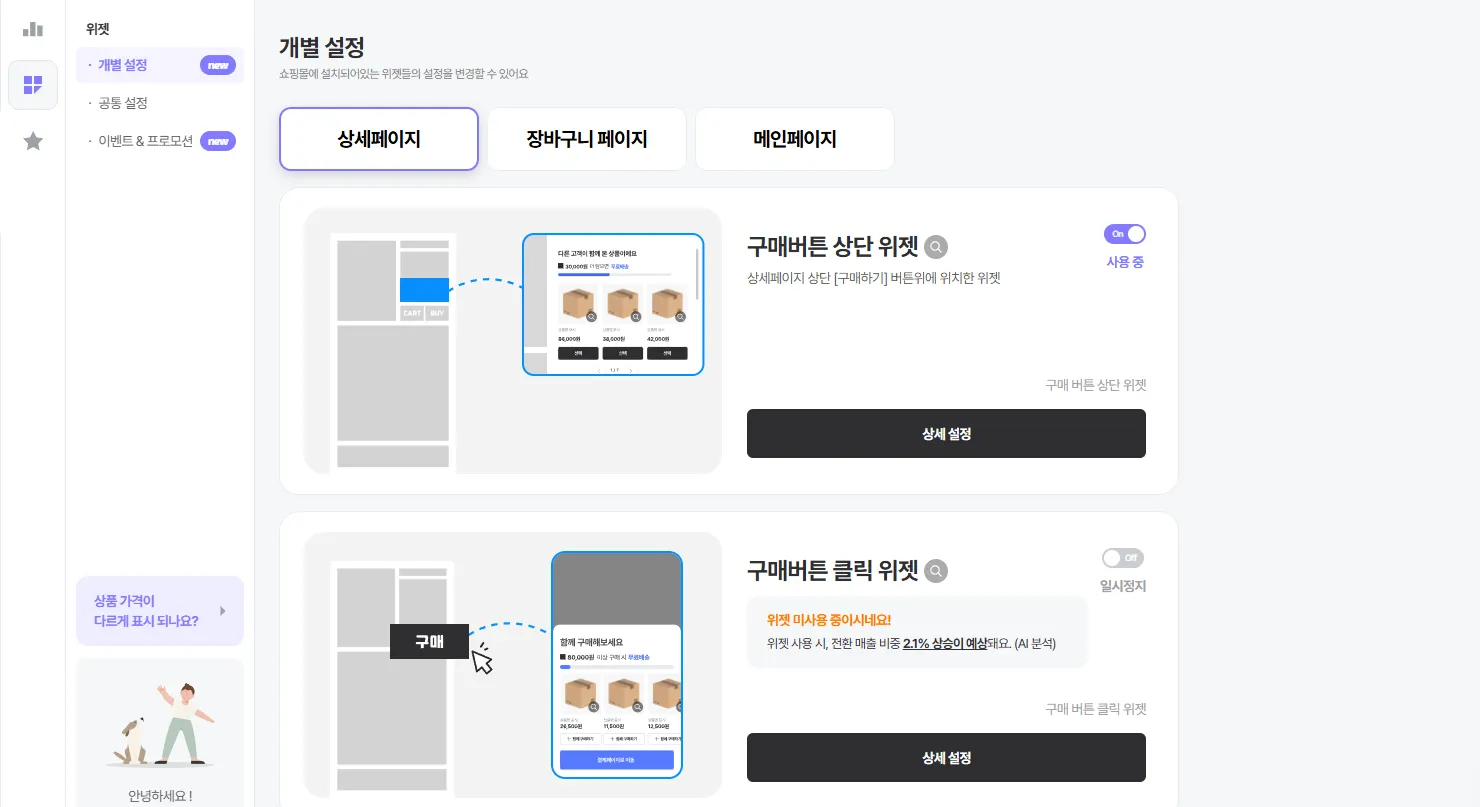 알파업셀은 모든 위젯이 활성화된 상태로 서비스 개시가 이루어져요. 사용을 원하지 않는 위젯은 서비스 개시 이후 대시보드 내에서 비활성화 해 주세요!