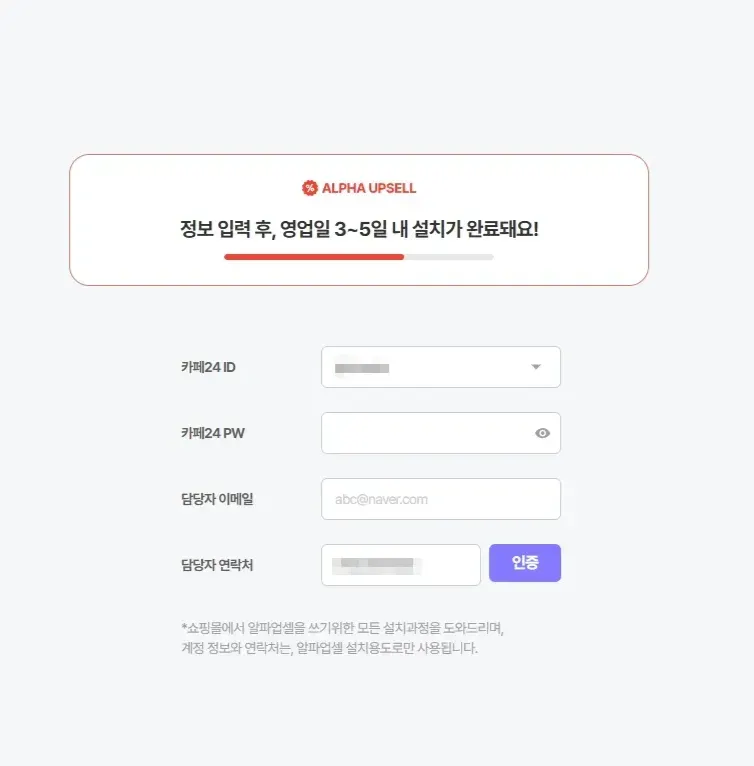 알파업셀 재도입 시에도 최초 도입과 동일하게 앱 설치 및 필수 사항 입력이 필요합니다.