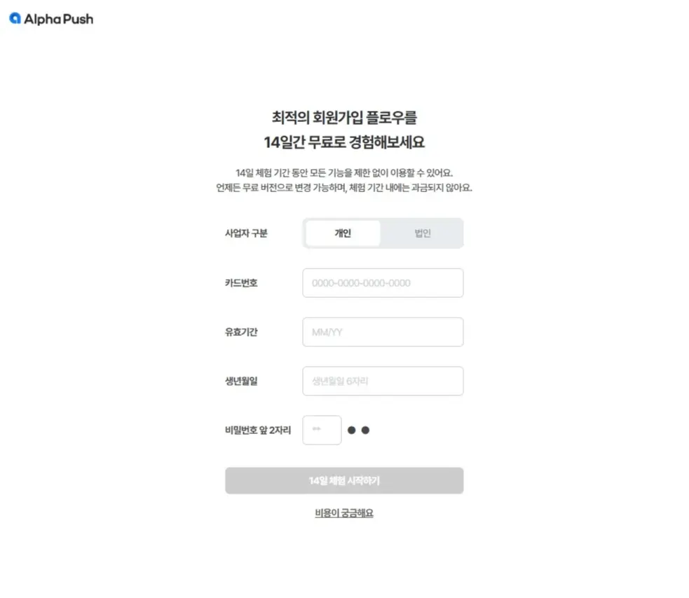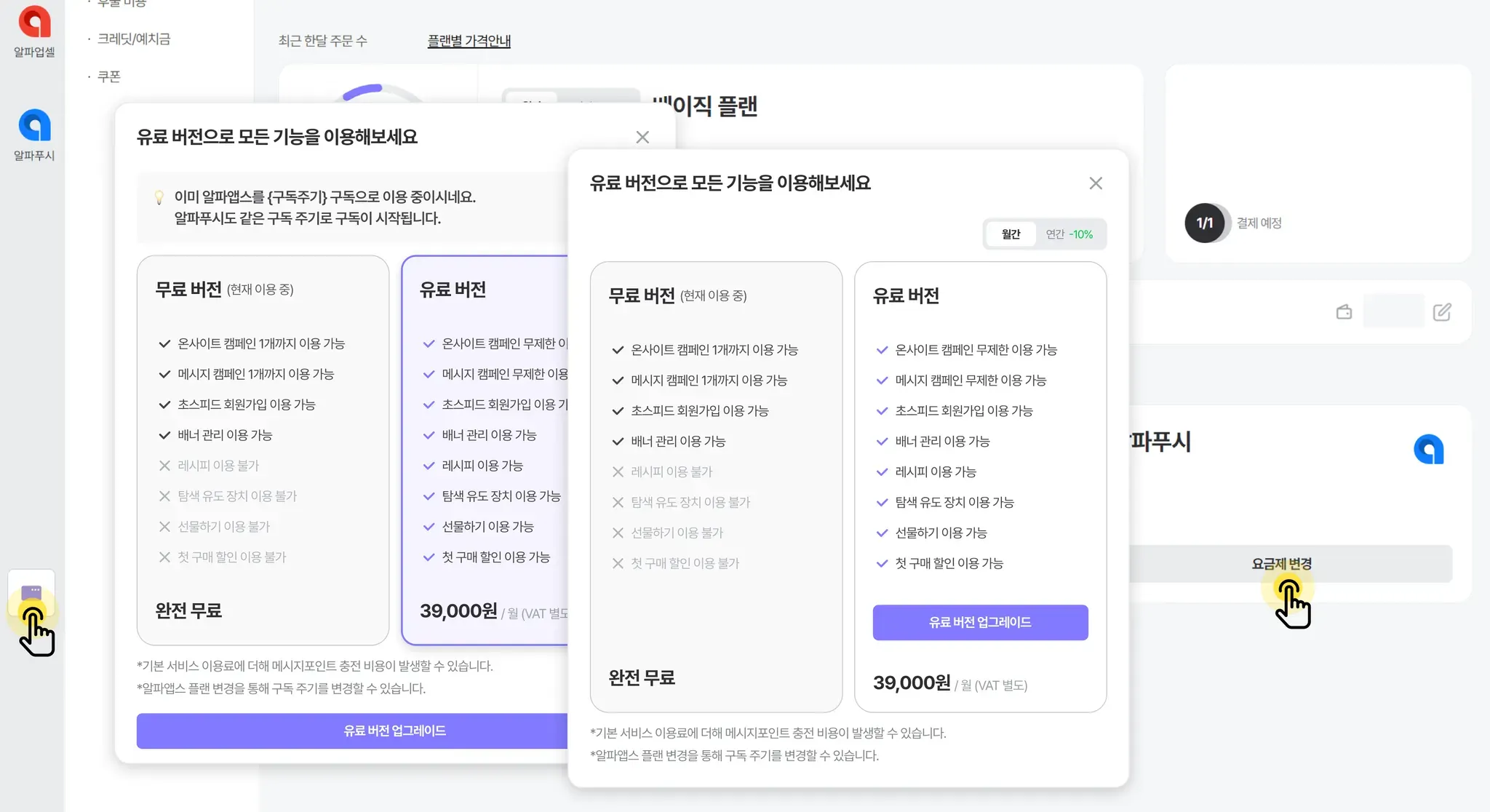 알파푸시는 재도입 시에 자동으로 무료 버전이 적용돼요. 유료 버전으로 사용하고 싶으시다면, 대시보드에서 구독 상태를 변경해 주세요.