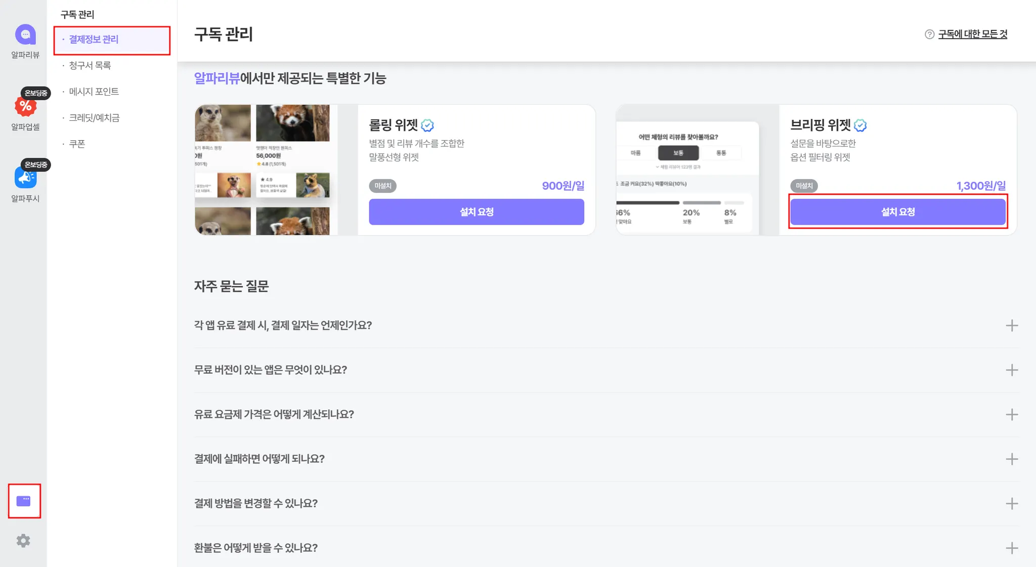 접속 경로: [구독관리 > 결제정보 관리 > 브리핑 위젯 "설치 요청"]