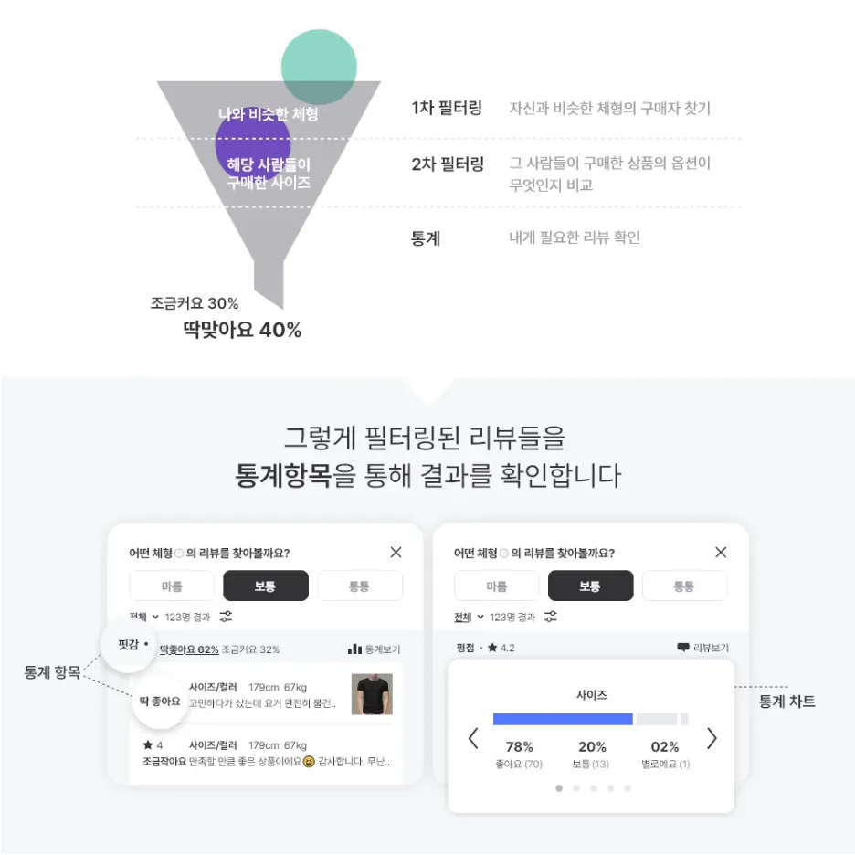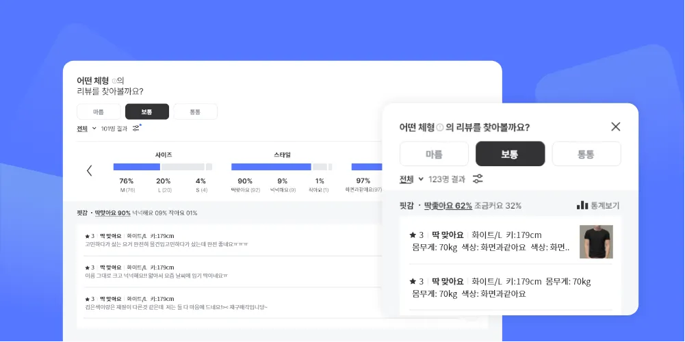 나와 비슷한 체형의 구매자들은 어떤 사이즈를 구매했는지 구매 옵션부터 구매 후기까지 모두 쉽게 확인해 볼 수 있어요