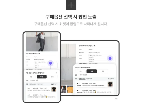 브리핑 위젯이란 고객의 구매 옵션, 설문 답변(사이즈, 체형 등)을 한 눈에 볼 수 있어 구매율을 상승시키고 반품율을 낮추는 프리미엄 위젯이에요