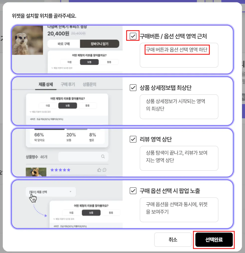 설치를 원하는 영역의 체크 박스 체크 후 구체적인 위치를 작성 해주시고 선택완료 버튼을 눌러주세요!