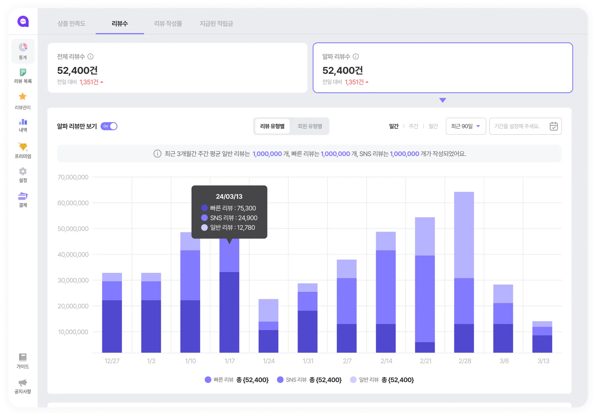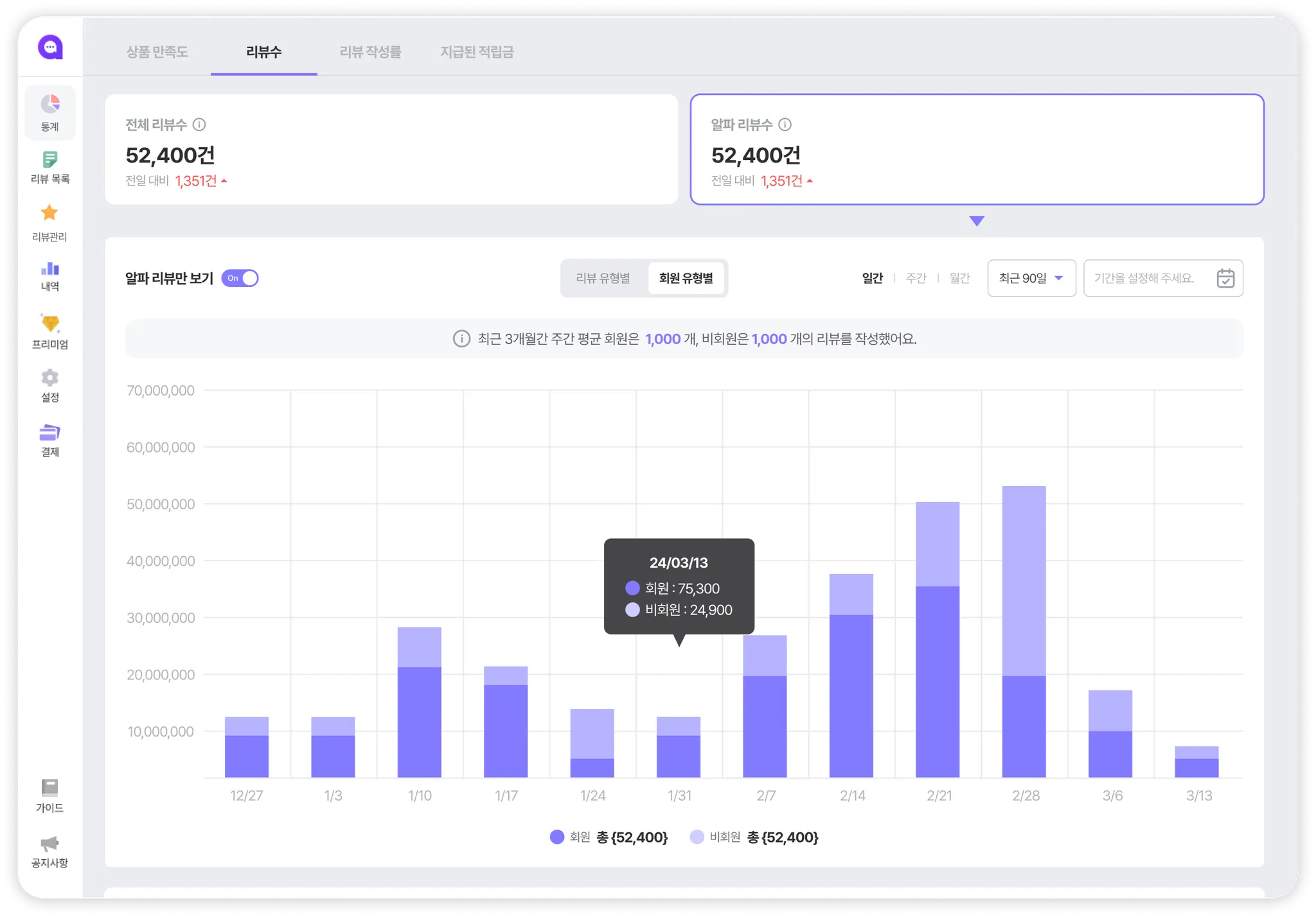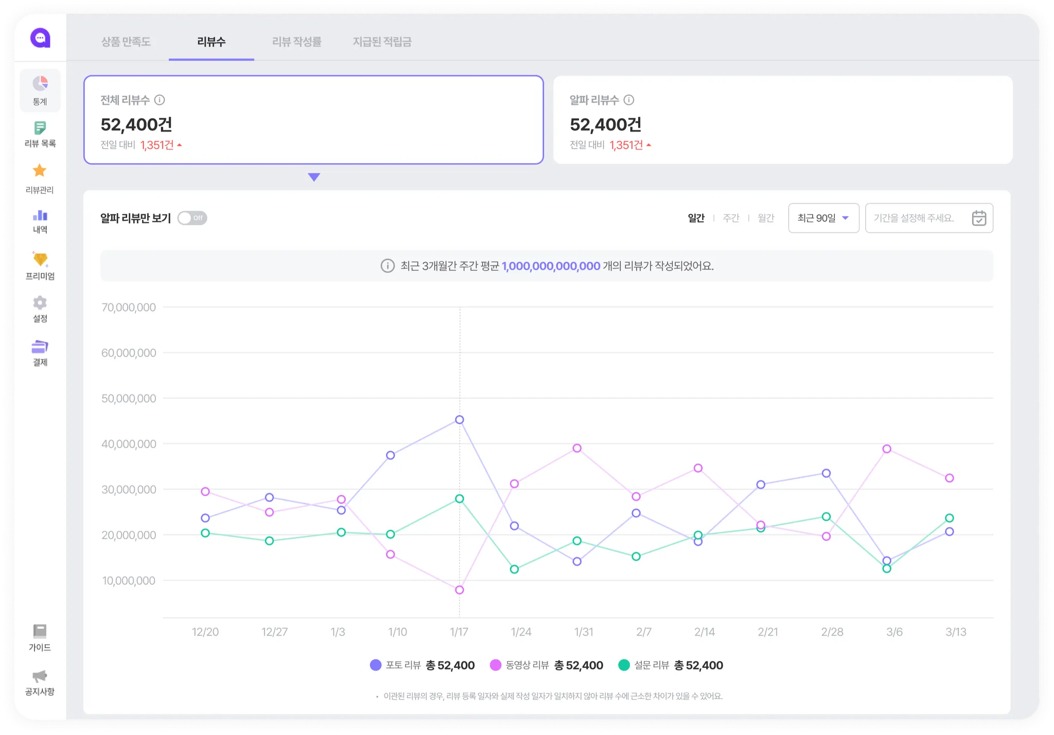 리뷰는 상품에 대한 “증명”입니다. 따라서 많은 리뷰를 노출하는 게 중요하겠죠? “리뷰 수” 데이터를 통해 우리 사이트는 얼마나 많은 리뷰를 보여주고 있는지, 알파리뷰를 통해 얼마나 많은 리뷰가 작성되고 있는지 살펴보세요.