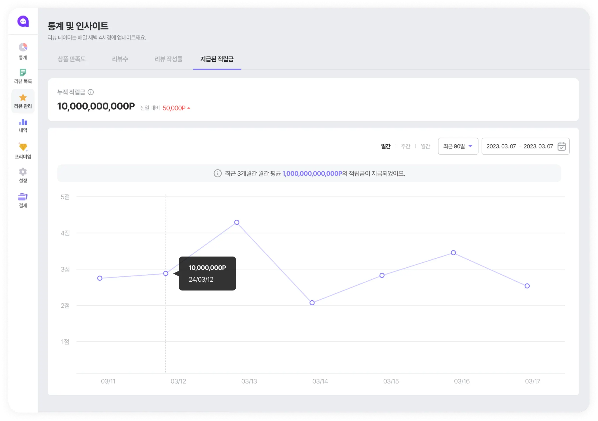 리뷰 작성 후 적립된 지급금 양을 확인해보세요. 적립금 지출량을 관리해 합리적인 마케팅 비용을 지출하세요.