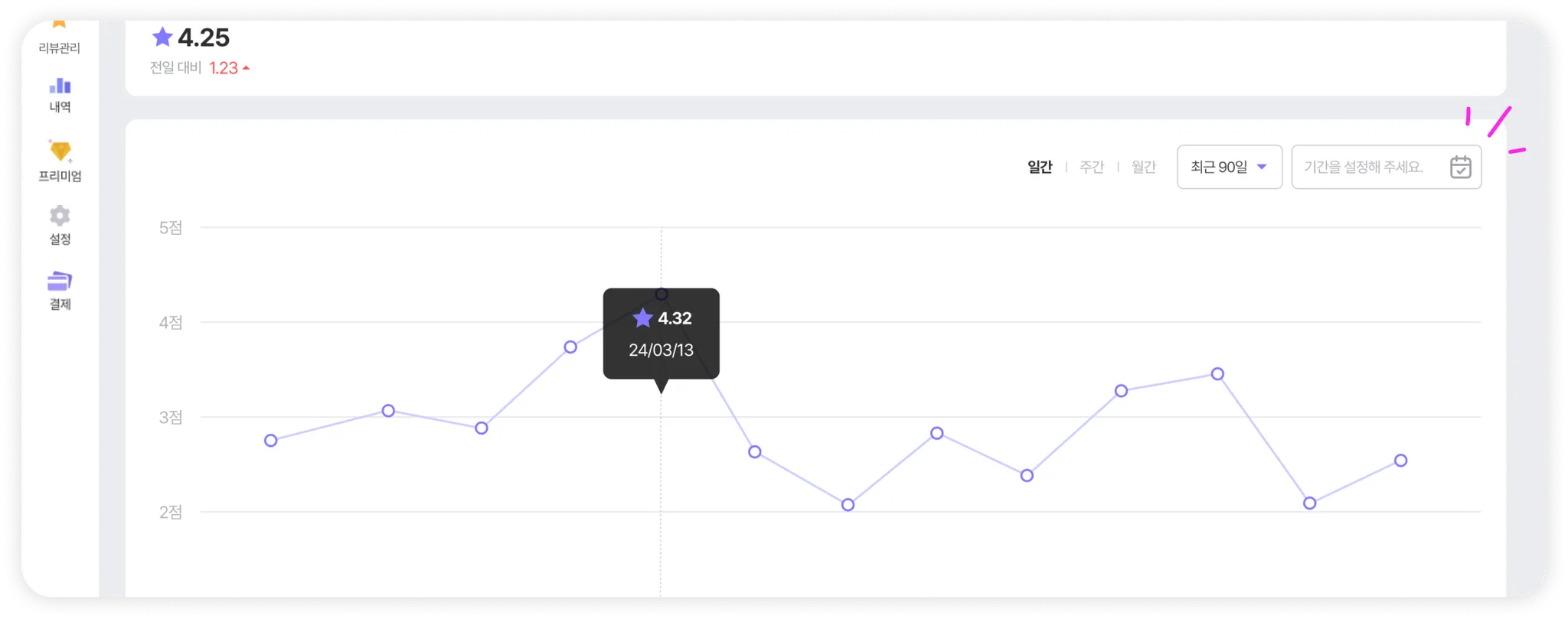 그래프 우측 상단에 “데이트 피커”를 지정해 확인하고 싶은 데이터 기간을 지정하거나, “일간/주간/월간” 보기 버튼을 클릭해 묶어볼 데이터 기간을 선택할 수 있어요.