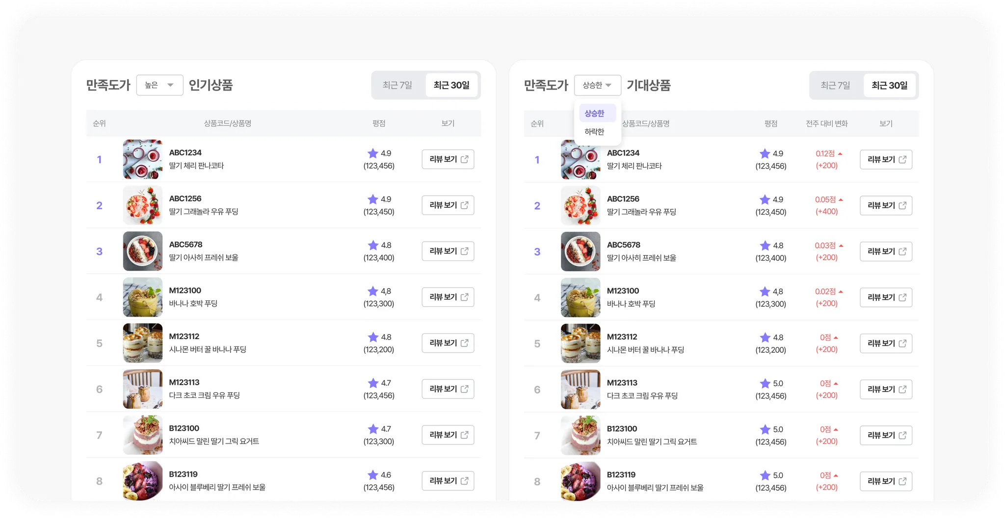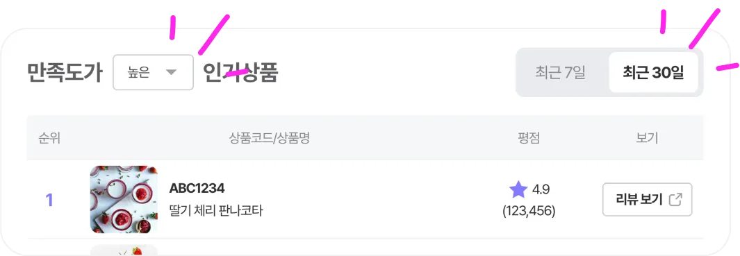 리뷰는 VoC(Voice of Customer)이자 고객 신뢰의 결정체입니다. 우리 상품은 고객에게 얼마나 신뢰받고 있는지, “상품 만족도” 데이터로 살펴보세요.